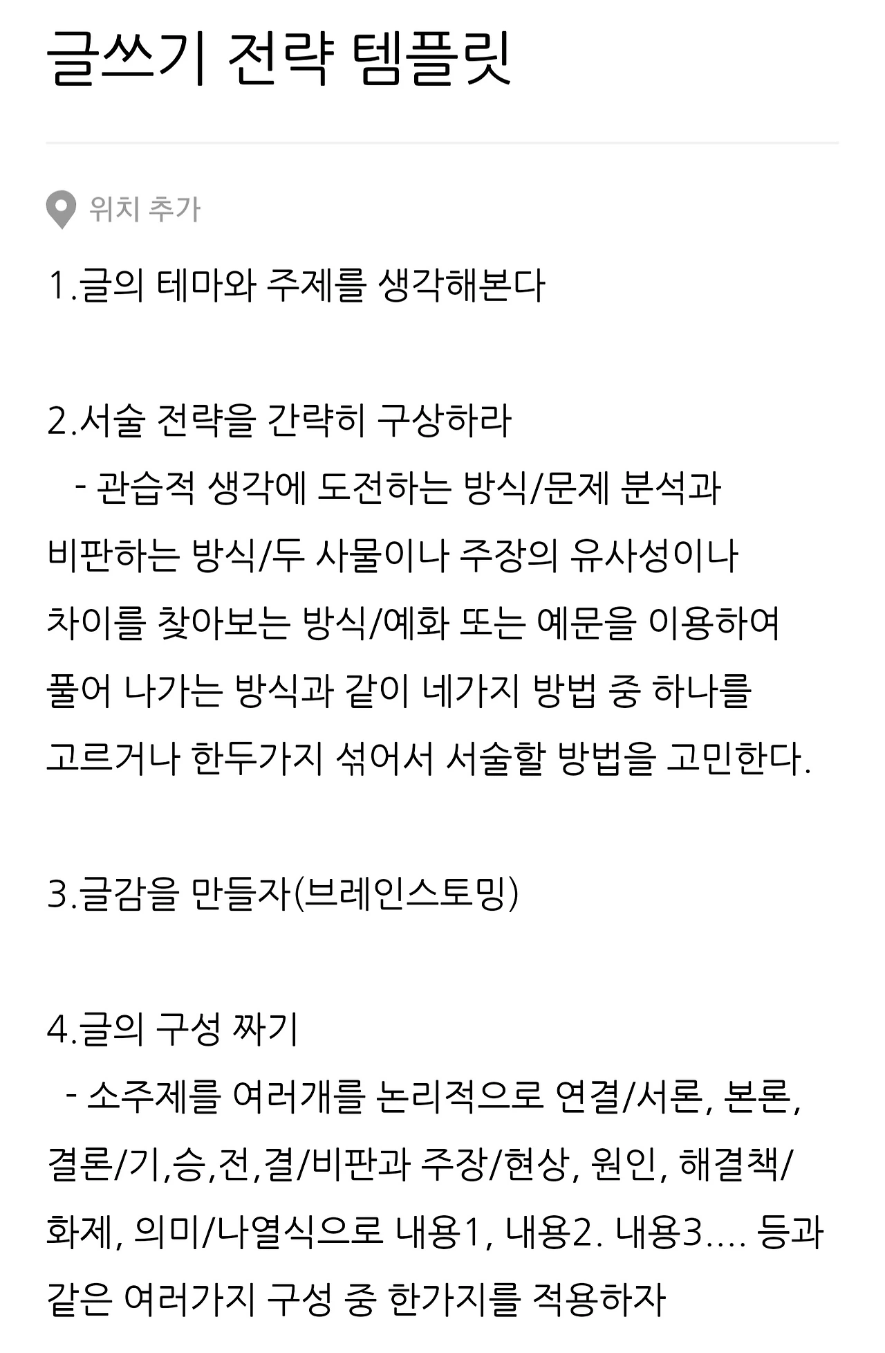 글을 쓰려고 컴퓨터를 켜고 제목을 적고 나니 요즘 꼭 지키고 있는 글쓰기 템플릿이 떠올랐다. 멀리서 저를 열심히 응원해 주는 동료가 글쓰기는 꾸준한 연습이 좋다며 선물해 준 책을 읽고 만든 루틴이다. “글쓰기 전략” 책을 읽으면서 ‘그렇지’ 또는 ’ 이렇구나 ‘를 연발하며 공감하고, 전략을 세우고 글을 쓰는 습관을 들이면 작가와 독자 모두에게 좋겠다는 생각으로 아예 템플릿을 만들었던 것이다. 이 템플릿을 열어두고 사이사이 내용을 추가하고 템플릿을 지우고 자연스럽게 연결을 하여 글을 완성하는 방법으로 이용하고 있다. 자꾸 틀에 맞추어 쓰다 보면 습관화될 것으로 기대하고 있다.