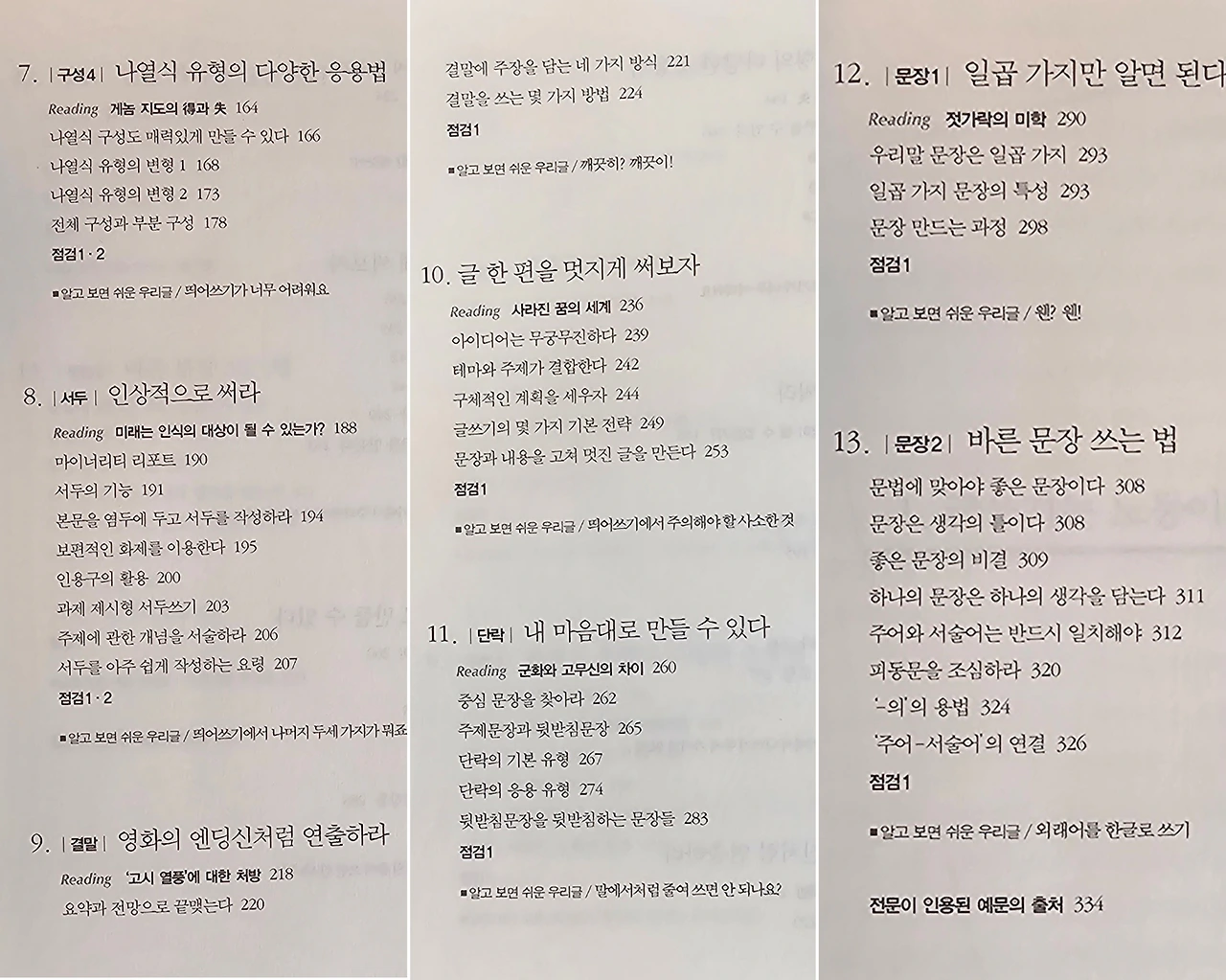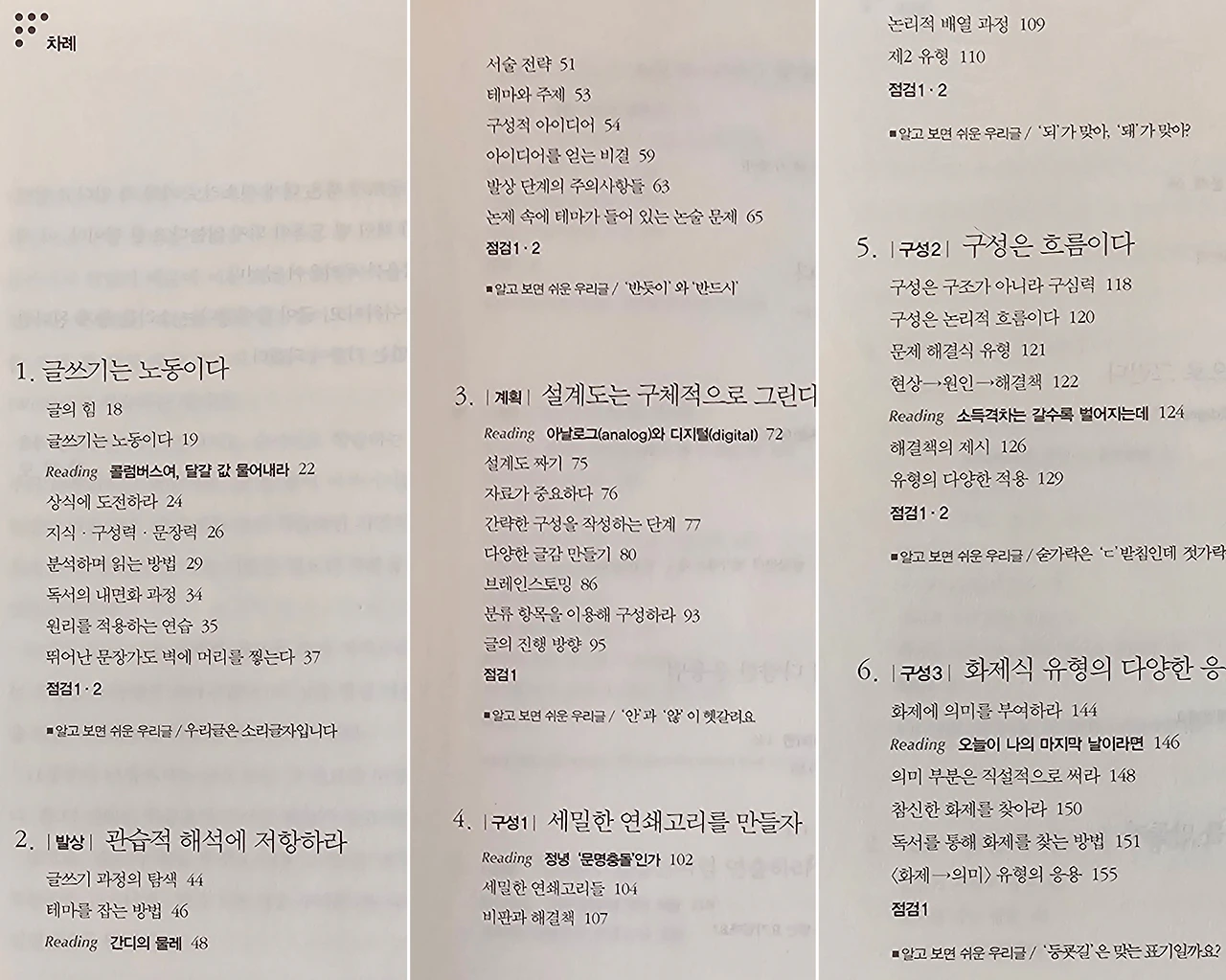 이 책은 위의 템플릿과 같이 생각을 글로 바꾸기까지 과정을 프로세스화 할 수 있도록 알려주는 책이다. 다양한 경우와 사례를 보여주고 있으니 이 중에 자기에 맞거나 혹은 그때의 주제에 맞는 과정을 선택해서 글로 써 나가면 좋겠다. 특히 사례가 많아서 여러 권의 책을 단숨에 읽은 느낌도 든다. 사례가 짧지 않고, 전문을 담고 구성을 논하는 방식이라 정말 여러 권의 책을 읽는 거 같다. 특히 읽고 싶은 내용을 담고 있는 글만 골라놓은 거 같아서 작가와 내가 생각이 닮았다는 기분도 든다. 책의 목차는 다음과 같다.