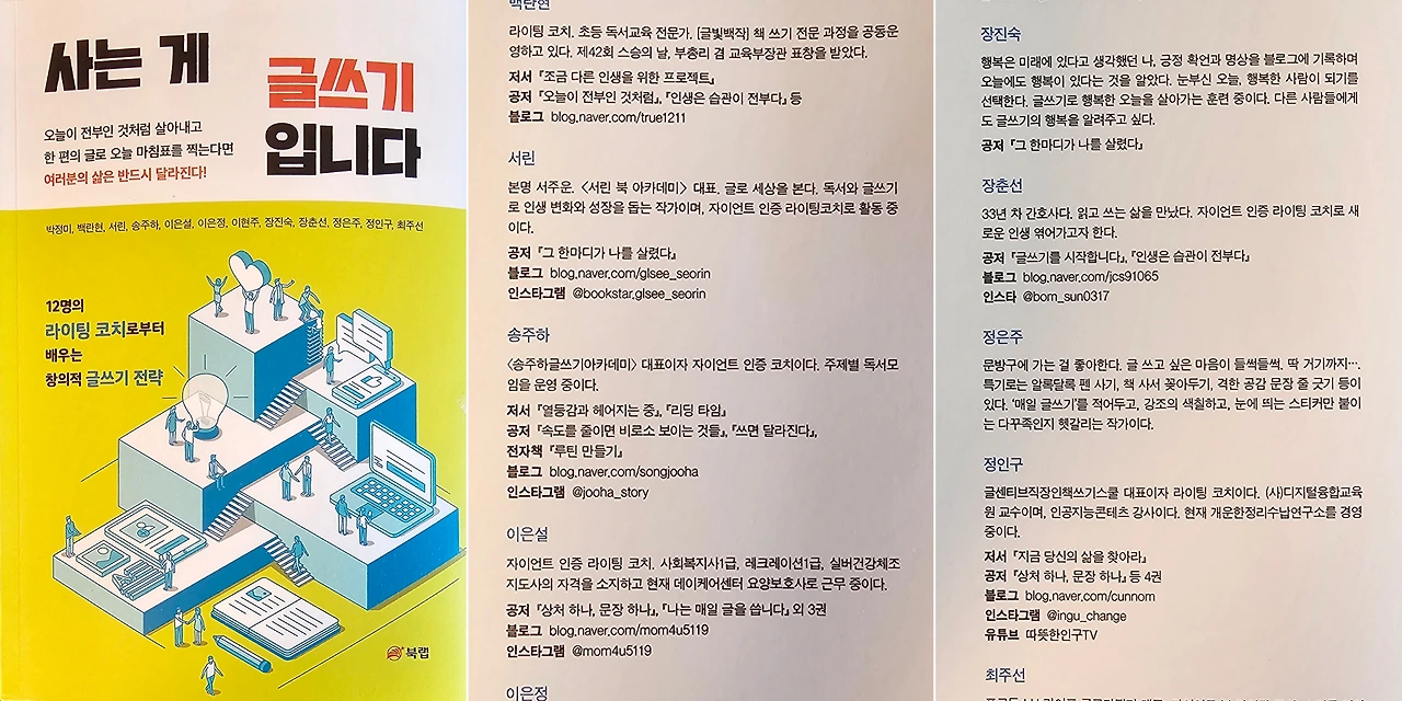 처음에는 퇴직이었다. 작년 말에 퇴직 통보를 받고서 겉으로 내놓지 못하고 마음에 쏟아놓은 눈물에 온몸이 물로 가득 차서 움직일 수 없다는 상상을 하며 미동도 하지 않고 누워 있었기도 했었다. 그러다 바닥에 서서히 몸을 녹여 넣고 그냥 이렇게 흙으로 되돌아가고 싶다는 생각마저 했던 그 순간들도 글쓰기에 비하면 작은 변화가 되어버린 것이다. 이삼 개월이 흘러 한동안 잊고 지내던 이런 맘을 새삼스레 다시 그대로 떠오르게 한 것은 “사는 게 글쓰기입니다” 책 덕분이다. 서평 쓰기에 지원해서 받은 책인데 작가 열두 분이 공동 저술한 책으로 글을 쓰기로 한 초심부터 글을 쓰고 있는 현재까지 4장으로 구성하여 써 놓은 책이다. 1장을 읽으며 처음 글을 쓰던 순간들에 대한 여러 작가분들의 사연을 반복해서 읽다 보니 글이 될까? 하면서 써보던 처음 그 순간이 생생하게 되돌아왔다.