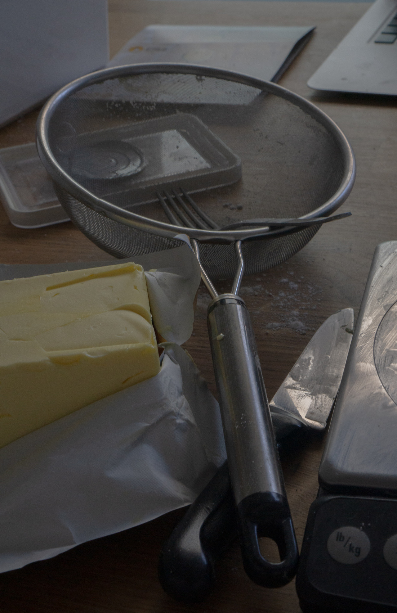 다용도로 정말 많이 쓰이는 도구. 버터를 크게 조각내거나, 도마 위 재료를 쓸어고 테이블 위를 정리할 때, 심지어 완벽한 케익 아이싱을 할 때도 쓰인다. 스테인리스 스틸의 단단한 것으로 가지고 있는 것이 좋다. 실리콘이나 플라스틱 스크레이퍼는 큰 볼에서 반죽 등을 긁어낼 때 편리하다.