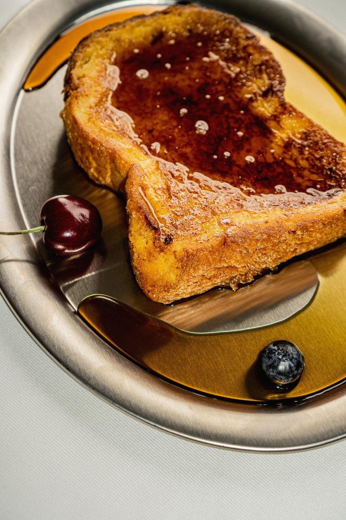 두껍게 썰은 브리오슈 빵을 바닐라와 크림을 넣은 달걀물에 푹 담가 적신 것을 구운 프렌치토스트. 메이플 시럽이 충분히 얹어져 있고 블루베리와 딸기가 흩뿌려져 있다. 반으로 갈라 두 개로 만든 바나나는 토치로 그을려 놓아 바삭하다. 빵은 관대하리 만큼 두껍게 잘라서, 포크로 누르면 손날로 베개를 누르는 듯 푹신하게 잘라진다. 프렌치토스트를 만들 때는 신선한 빵보다는 최소 하루는 지나 수분이 약간 날아간 빵이 알맞다. 달걀물에 빵이 담가지는 과정에서 꽤 건조한 빵이라야 달걀물을 더 잘 흡수할 수 있기 때문인데, 그렇다고 또 너무 오래 두면 빵이 뭉개져 분해되는 수가 있어서 적절한 타이밍이 중요하다. 달걀물에 잠시 담갔다가 꺼낸 빵은 살살 흔들어 계란물을 덜어낸다. 이 것을 하지 않으면 구울 때 토스트 주변으로 달걀 스크램블이 생겨서 깔끔하지 않다. 빵에 흡수된 달걀물만 남기고 나머지를 쪼르르 털어낸다는 생각으로 하면 된다. 약불로 달궈진 팬에 버터를 두르고, 토스트를 구울 때는 색이 너무 진해 지거나 타지 않도록 불 조절과 적당한 조리 시간이 중요하다. 준비부터 조리까지 마음 편히 만들 수 있는 음식은 아니다. 또 그 사이엔 잘 구워진 베이컨도 만들어지고 있어야 하고, 나머지 빵들을 굽는 동안 다 구워진 프렌치토스트 조각들이 식지 않도록 따뜻한 오븐에 넣어놓아야 한다. 빵의 종류는 알아서 선택하면 되는데, 보통은 브리오슈 계열 식빵이나 할라(challah)를 사용하기도 하고 사워도우 빵도 좋다. 사워도우로 만들면 크러스트가 무척 질길 것 같지만 달걀물로 적셔 굽기 때문에 부드러워진다. 무슨 빵을 이용하더라도 2.5센티 이상 두툼하게 썰어주는 것이 중요하다. 만들기 전 하루 정도는 빵을 실온에 방치하는 것은 구운 후에도 두께와 형태를 유지시켜주는 역할도 한다.