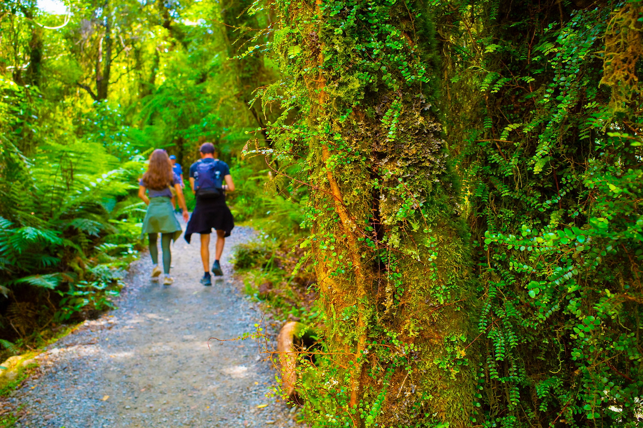 호키티카 고지(협곡)로 발걸음을 옮긴다. 주차 후 온대우림으로 울창한 숲길을 함께 걷는다. 하늘로 죽죽 뻗은 아름드리나무의 껍질도 온통 이끼로 덮여있는 모습이 장관이다. 쉐인과 두 명이 함께 팔을 벌려 안아도 부족하다. 쉐인이 말하길, 이 나무 수종은 미국 서부가 원산지인 레드우드인데 뉴질랜드 웨스트코스트 지역은 습하고 비가 많아 원산지인 미국보다 네댓 배는 빨리 자란단다. 이렇게 거대한 레드우드도 생각보다 수령이 많지 않다.