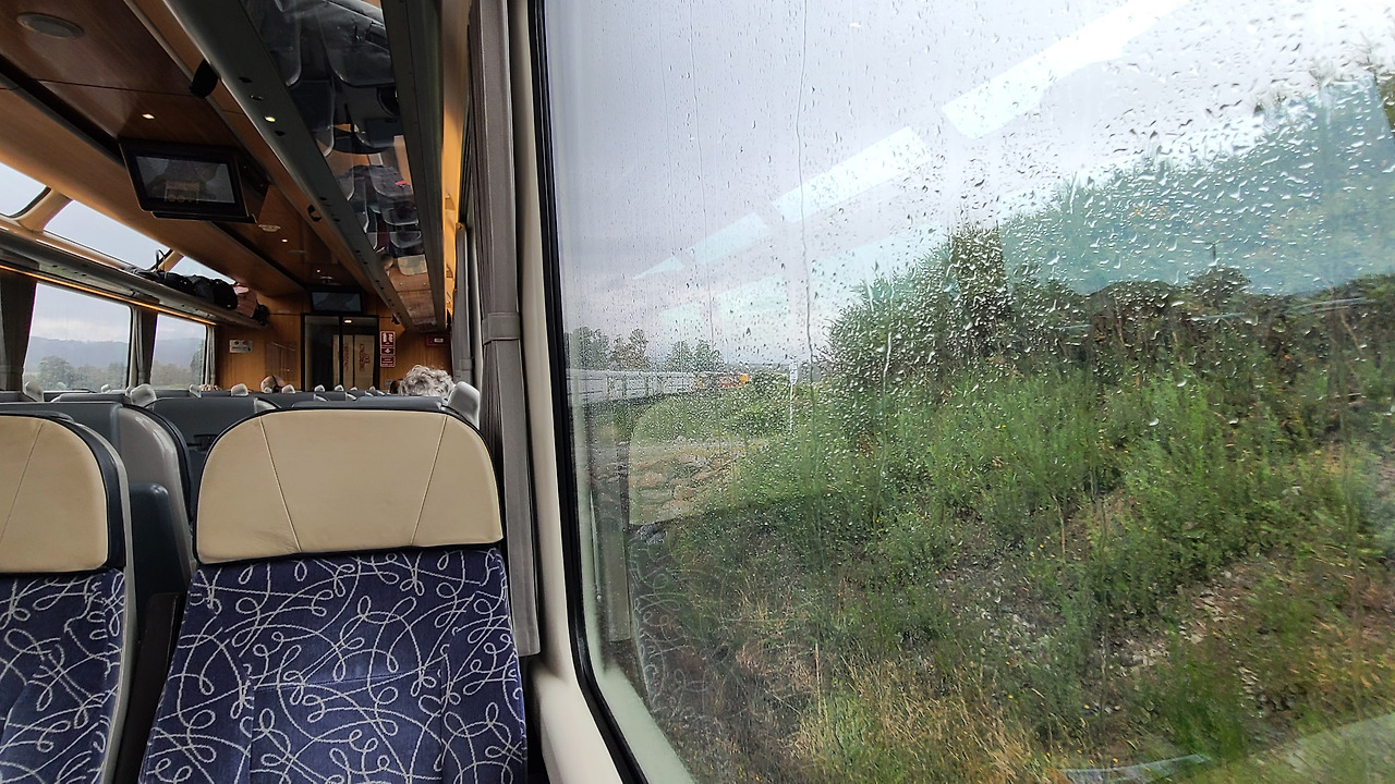사울 레이터의 사진처럼 빗방울로 얼룩진 창 밖 풍경을 보며 그레이마우스역을 천천히 출발했어. 흐릿한 경치를 보면서.