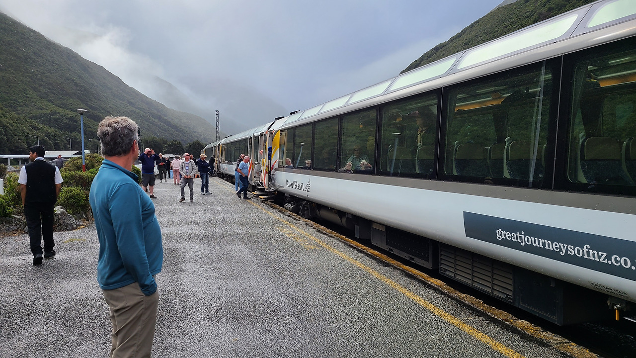 오티라 터널에 진입하기 전에 아서스패스 역에서는 좀 길게 10분 정차해. 승객은 다들 내려 사진 찍기에 여념이 없지