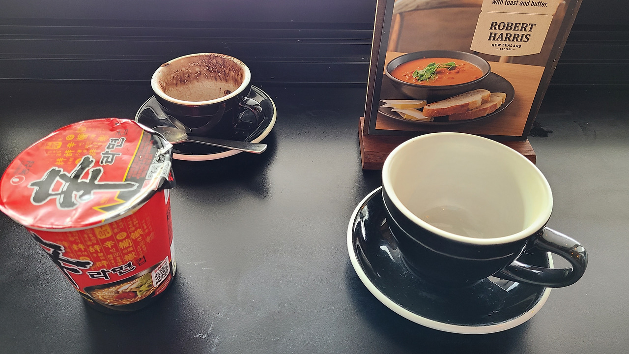 그레이마우스 역으로 향했어. 뉴질랜드의 여름은 우리의 더운 여름이 아니야. 비바람도 거세고 쌀쌀하더군. 따끈한 국물이 생각나는 날씨였어. 배낭에 컵라면이 있었잖아. 커피숍에 들어갔지. 염치불구하고, 커피를 주문하고는 덤으로 뜨거운 물 한 컵 부탁했지. 그런데 카페 직원이 못 알아듣는 거야. 결국 물은 채웠어. 끓는 물은 아니었지만 컵라면 먹기에는 충분했어.