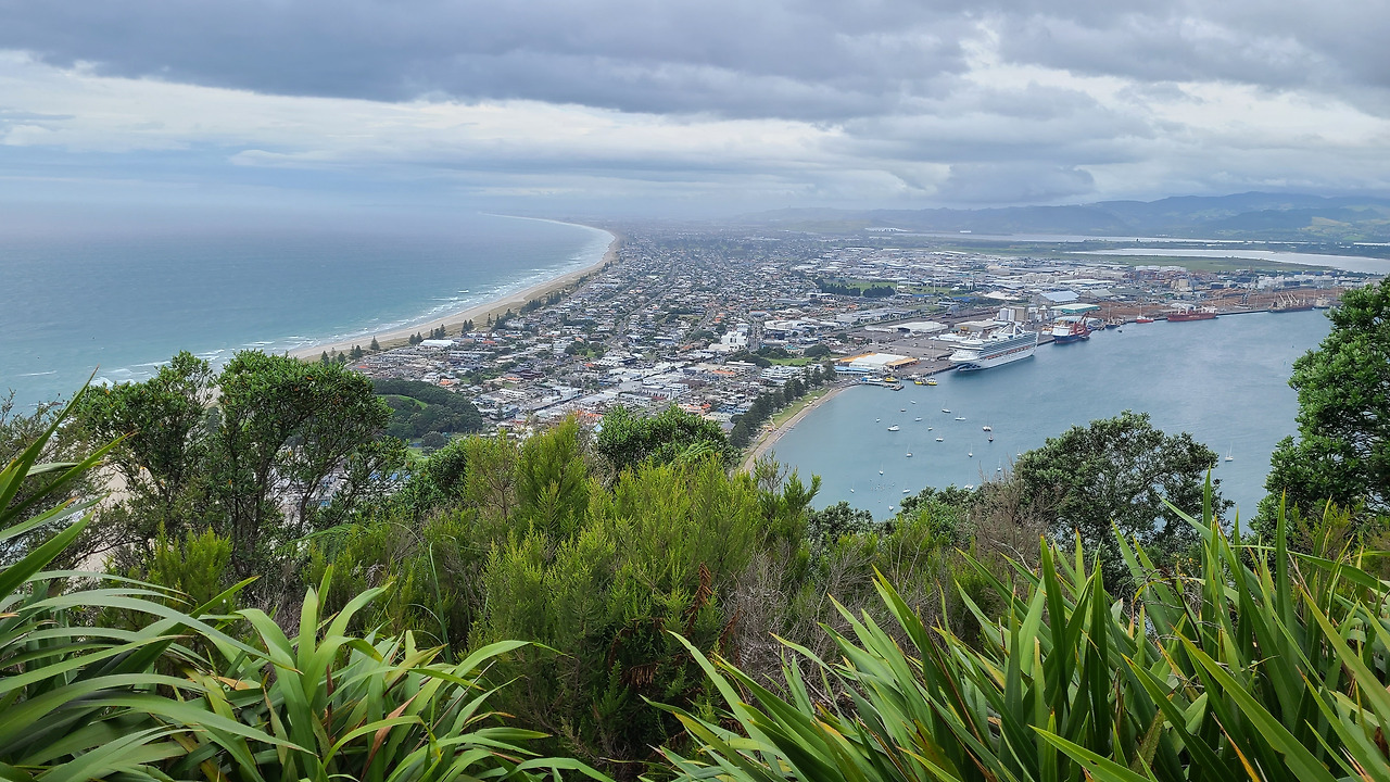날씨가 흐리다. 간간히 빗방울도 떨어지고. 그럼 어쩐다? 그래도 우리는 마운트 망가누이로 향했어. 마운트 망가누이 트레킹을 안하고 타우랑가를 여행했다고 할 수 없잖아. 그 만큼 마운트 망가누이는 타아랑가의 상징이야. 230m로 그리 높지 않지만 해변에 솟은 도드라진 화산이라 완만한 등산로를 오르며 보는 바다,해변,도시가 어우러진 360도 서라운드 뷰가 일품이지. 특히 동쪽으로 길게 뻗은 해변이 멋져. 마운트 망가누이를 검색하면 산에서 내려다 보이는 해변 사진이 먼저 나올 정도로.
