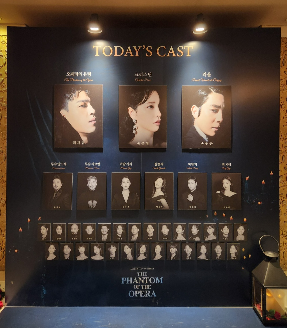 2023.09.05. <오페라의 유령> 밤공 캐스팅보드더 쓰려면 더 쓸 것도 많은 <오페라의 유령>이지만 하고 싶은 말은 다 담아낸 것 같아 여기서 줄일까 한다. 굳이 더 몇 마디 얹자면 칼롯타 역의 한보라 배우, 유령 횡포만 없었으면 그냥 프리마돈나 그대로 했어도 됐겠다 싶을 정도로 노래를 잘했다. 그리고 유령의 분장이 생각보다 훨씬 더 징그러워서 멀리서 봤는데도 눈살이 찌푸려졌다. 물론 그 정도로 흉측한 얼굴인 만큼 더 몰입감 있게 유령의 삶을 짐작할 수 있겠지만, 저 얼굴을 똑바로 바라보며 감정을 나눠야 하는 크리스틴 역 배우들이 대단하다고 느꼈다. 그리고 주연 배우들 프로필이 그다지 마음에 안 든다. 다들 실물이 훨씬 낫더라.