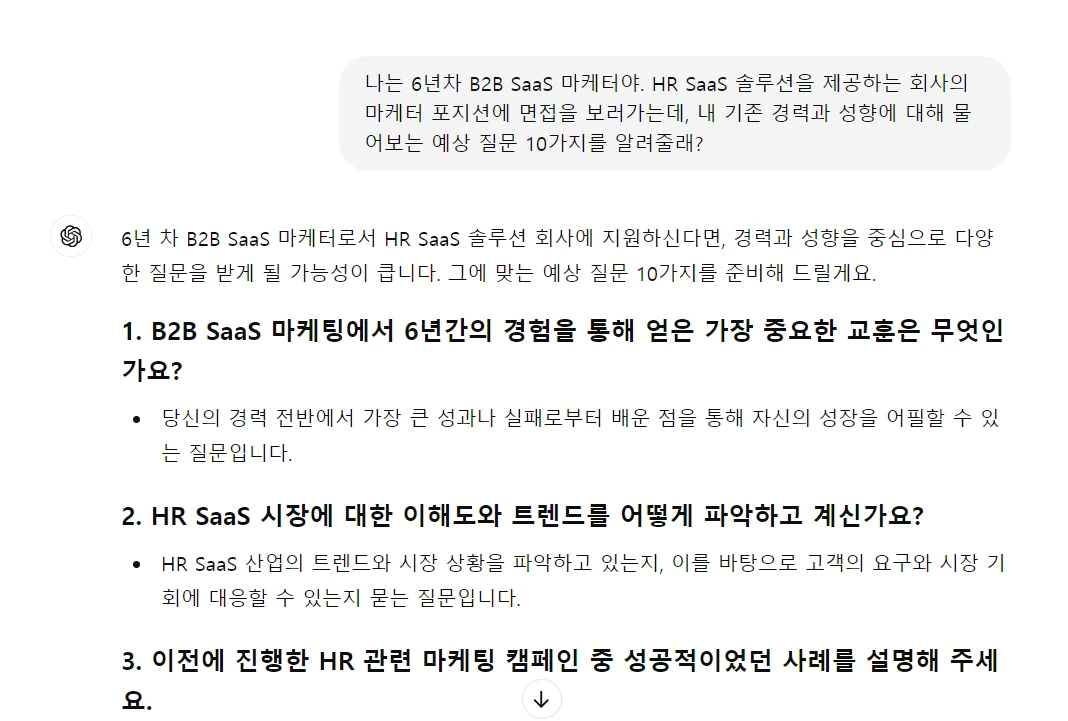 GPT가 예상 질문 리스트를 뽑아주자마자 ‘물어보길 정말 잘했다'는 생각이 들었다. 만약 준비되지 않은 상태에서 이런 질문을 받았다면 긴장한 상태에서 머릿속이 새하얘졌을 게 분명했다.