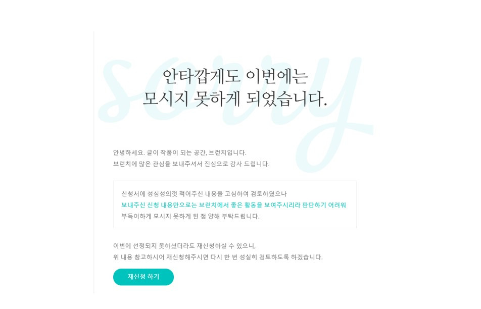 지원서도 성실하게 작성했고, 레퍼런스로 나름 공들여 쓴 글도 3편이나 제출했는데 브런치 팀은 나를 계속 떨어트렸다. 내가 부족한 이유라도 알면 그걸 보완해서 다시 지원할 텐데, 그 어떤 피드백도 받을 수 없어 답답했다.