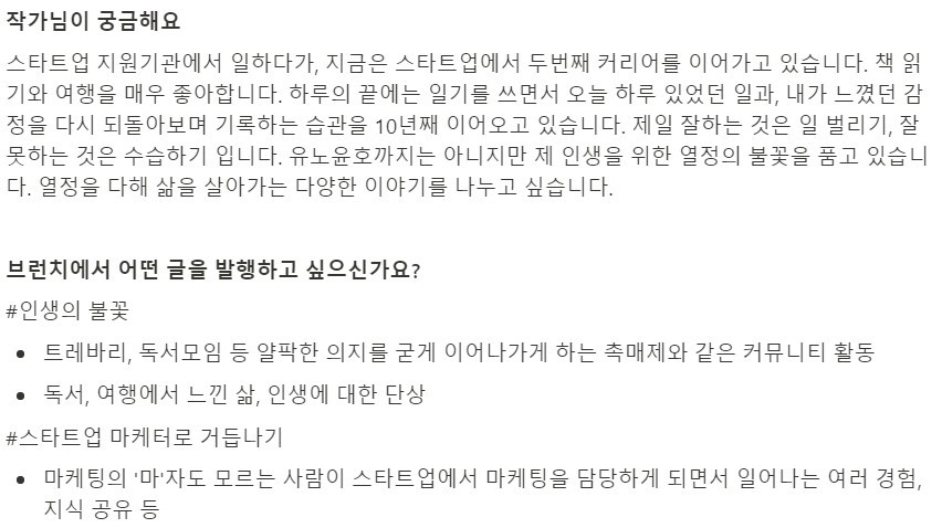 "참고로, 작가 신청 시 앞으로 발생하실 글의 주제나 활동 계획을 구체적으로 기재해주시면 검토에 크게 참고하고 있는 점 안내해드립니다."