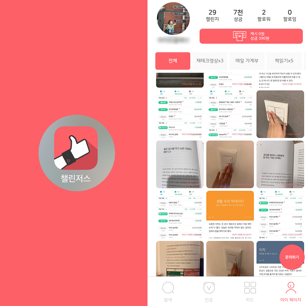여태까지 29가지의 챌린지에 참여했었는데 주로 #독서#재테크#운동#글쓰기 목표를 위한 챌린지들이 많았다. 그중 21개의 챌린지에서 100% 인증에 성공하여 6,500원의 상금을 타기도 했다. 한때 챌린저스를 소개하는 글을 쓰기도 하고, 만나는 주변 지인마다 극찬했을 정도로 나의 최애 앱에 등극했었다. 지금은 그때보다 챌린지에 참여하는 나의 열정이 다소 식은 듯 하지만, 챌린저스는 여전히 나의 삶을 발전시킬 수 있도록 도와주는 고마운 어플이다.