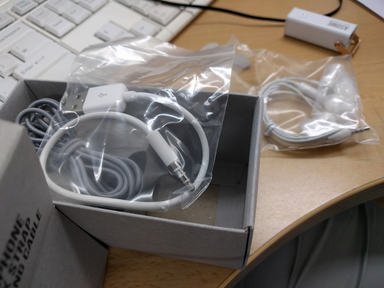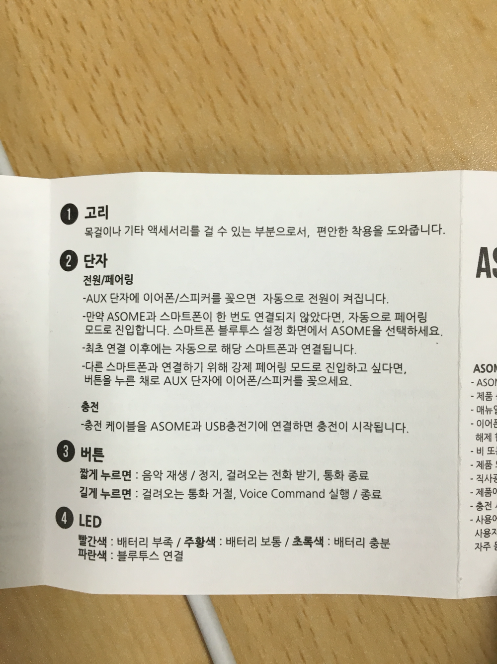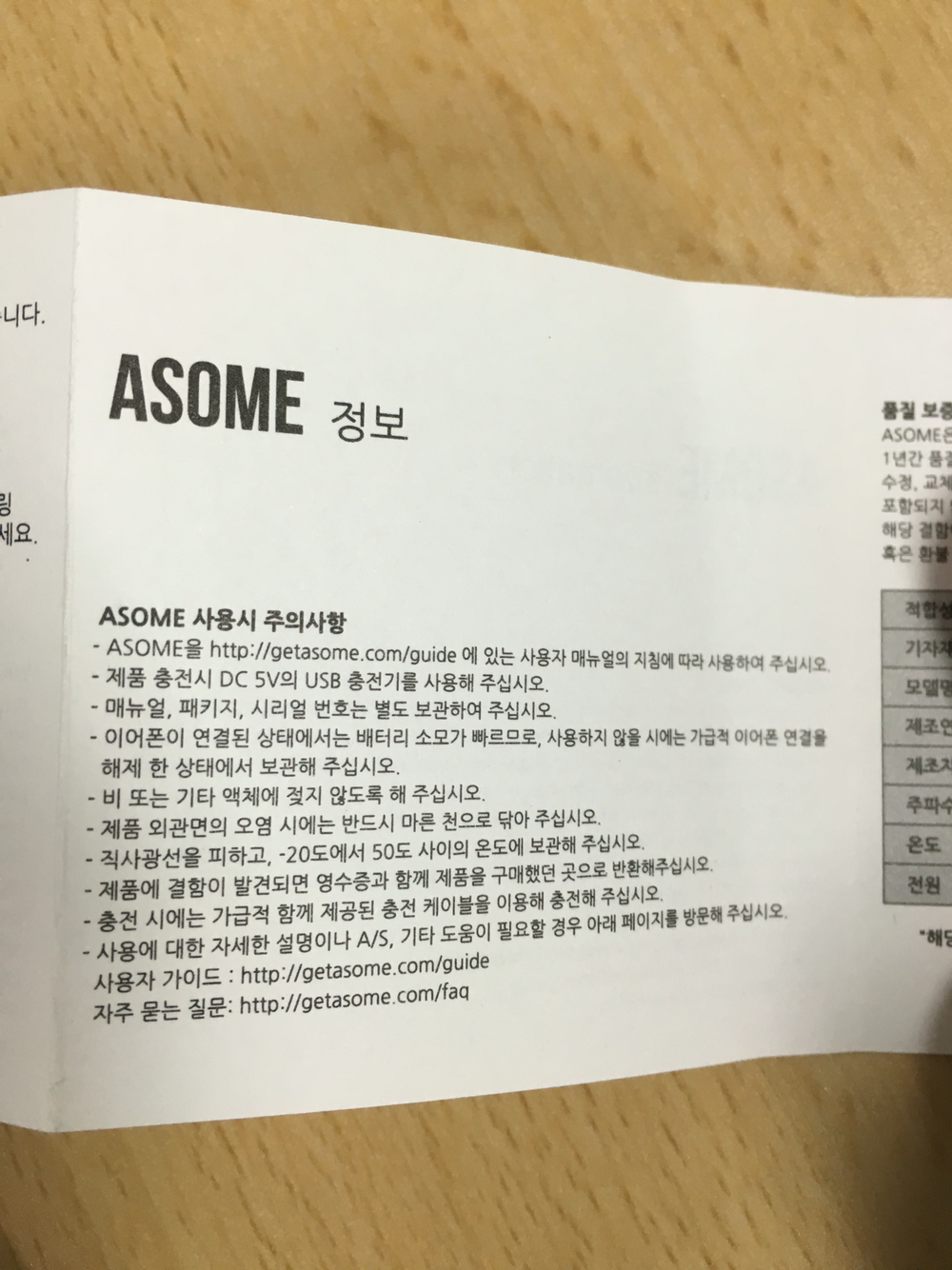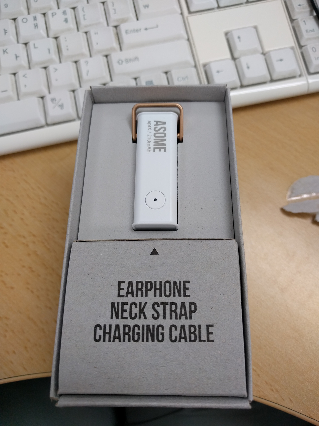 제품의 상세 구성을 살펴보면 ASOME 제품 이외에 충전을 위한 케이블 (3.5파이), 번들이어폰, 번들 목걸이가 들어 있다.