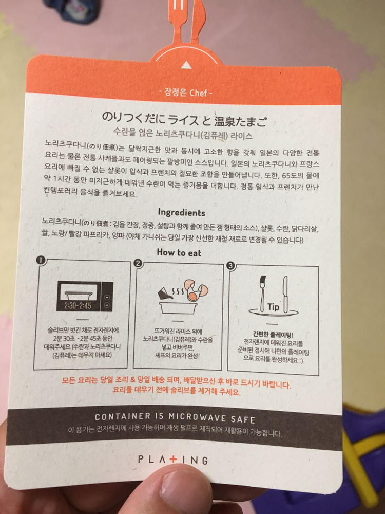 간략한 조리법과 재료들에 대한 내용이 상세하게 적혀 있기도 하다. 대부분의 메인 메뉴는 전자렌지에 데워서 먹어야 하며 그 조리시간에 대해서는 전자렌지의 차이에 따라 (몇 W인지) 다르게 설명이 되어 있다. 친절하기도 하면서 실제로 각각의 전자렌지에 따라 테스트를 해 보면서 최적의 맛을 고민해 본건지 궁금해지기도 했다.
