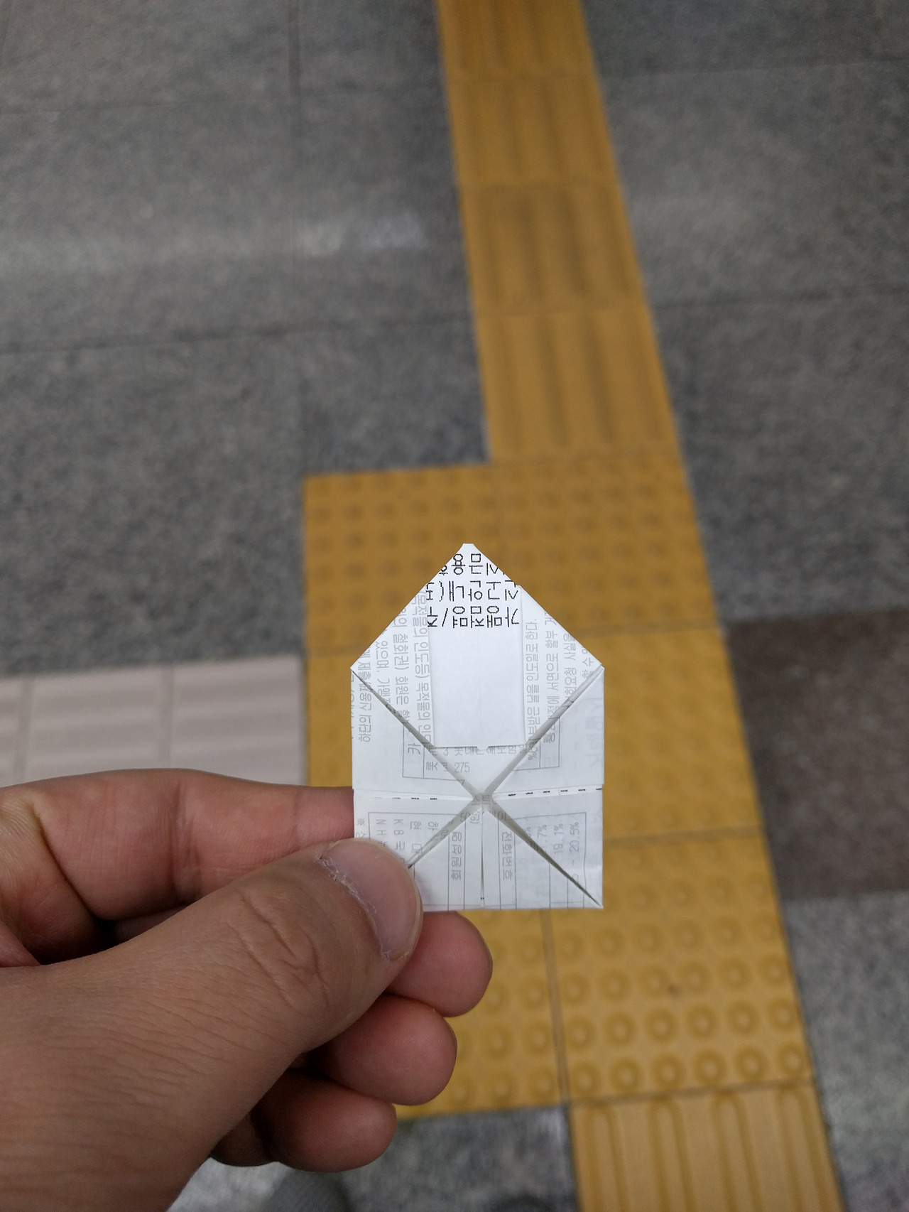 3. 손에 종이가 들려 있으면 끊임 없이 사선으로 줄을 맞추어 접는다. 영수증은 그 좋은 대상이다.