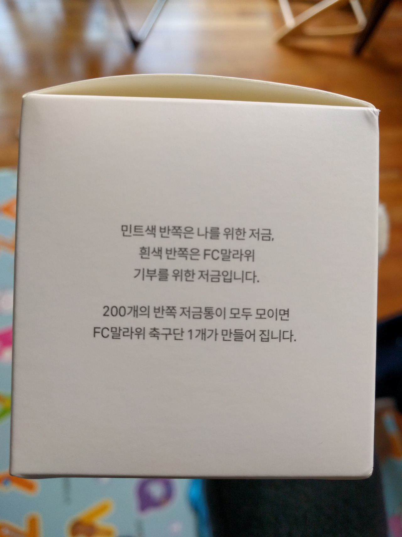 저금통은 크게 2개로 나누어져 있고 하나의 저금통은 나(우리집의 경우 아들)를 위한 저금통 그리고 나머지 하나는 말라위(말라위는 아프리카 남동부에 있는 나라이며 경제 수준이 GDP기준 세계 146위이다.)의 친구들에게 전달된다.