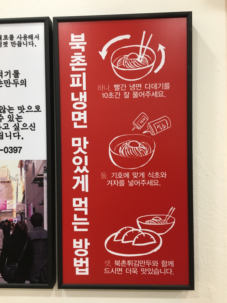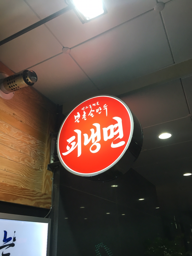간판의 한귀퉁이에는 이 곳의 주된 메뉴인 '만두'와 함께 앙상블을 이루는 '피냉면'이 빨간색 간판으로 걸려 있다.