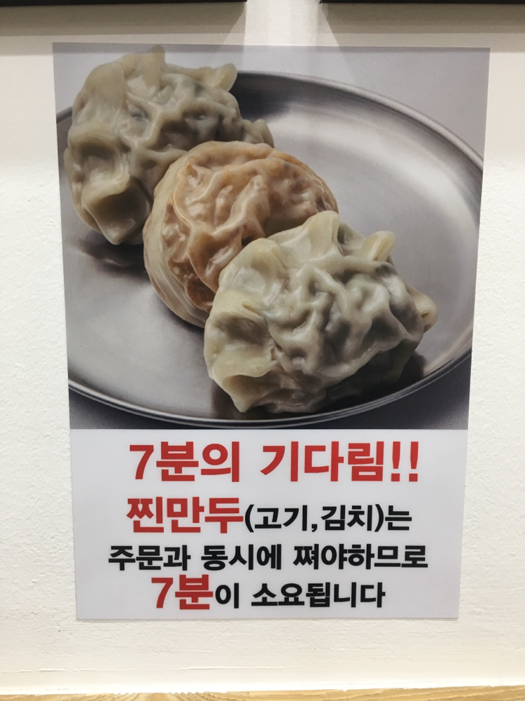 만두집이니 메뉴가 많지 않겠거니 싶지만 절대 그렇지 않다. 만두들은 그 형태와 속의 종류 그리고 튀김의 종류나 함께 곁들여먹는 양념등의 종류에 따라 많은 메뉴로 구성되어 있고 게다가 국수나 만두국 혹은 떡갈비 등까지 메뉴가 참 다양하다. 거기에 찐만두에 대해서 '7분'이라는 정확한 조리 공정 시간을 안내해 주는 친절함을 보이기도 한다.