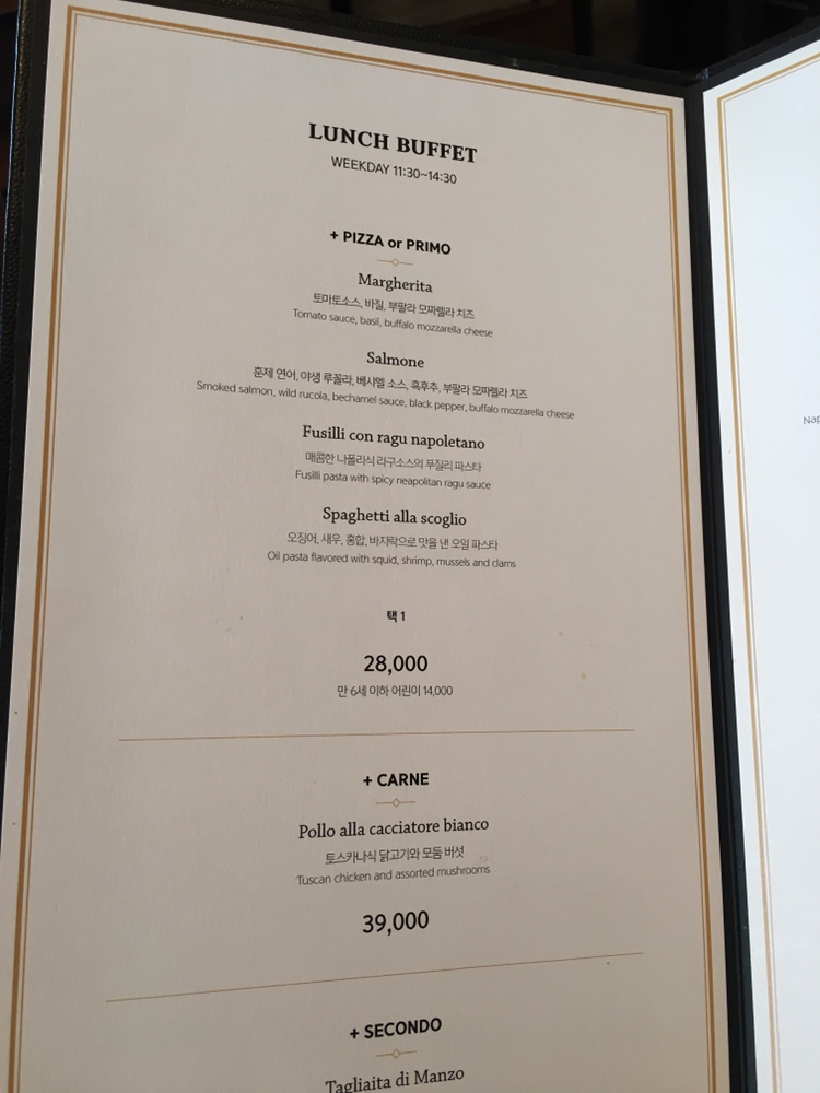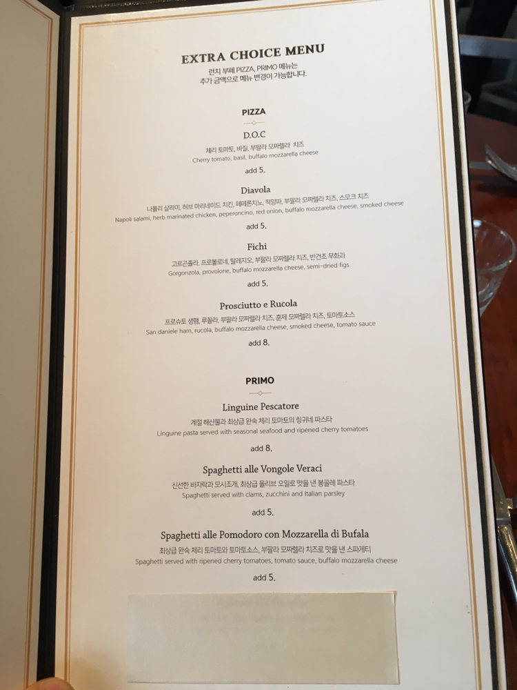 주 메뉴인 4가지 메뉴는 2만 8천원에 즐길 수 있다. 이외에도 5천원에서 8천원 정도의 돈을 더 내면 추가로 4개의 피자와 3개의 파스타를 선택할 수 있다. 그런데 살바토레 쿠오모의 대표 메뉴엔 D.O.C피자는 추가금을 내야 선택가능한 메뉴이다. 이때문에 아마도 많은 손님들이 추가금을 내고 메뉴를 선택하지 않을까 싶다.