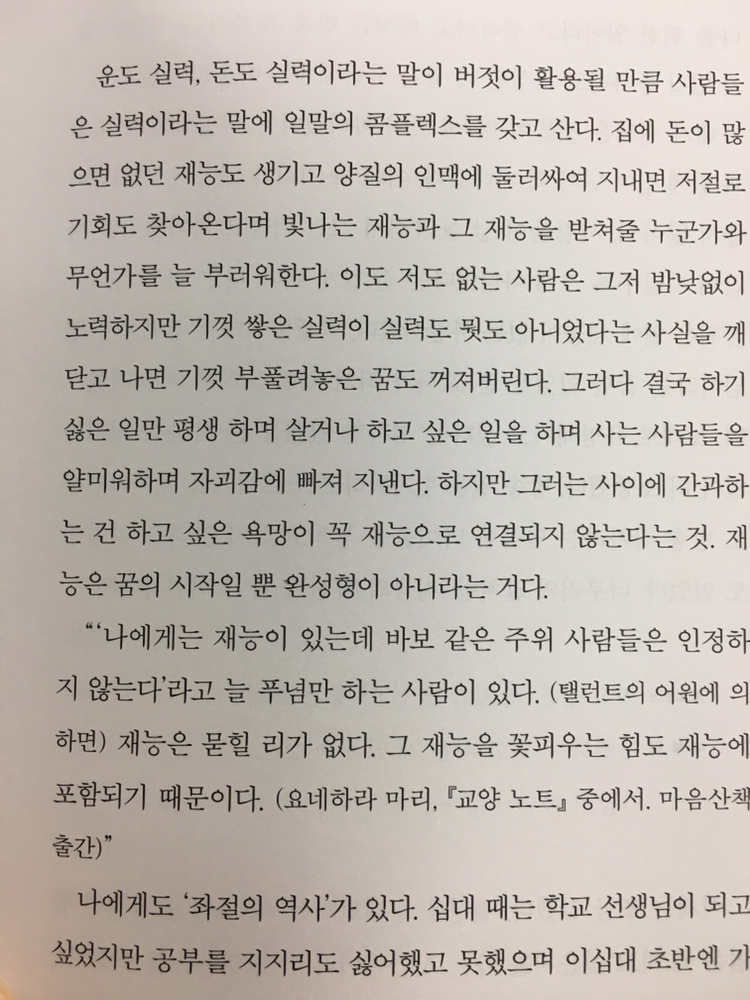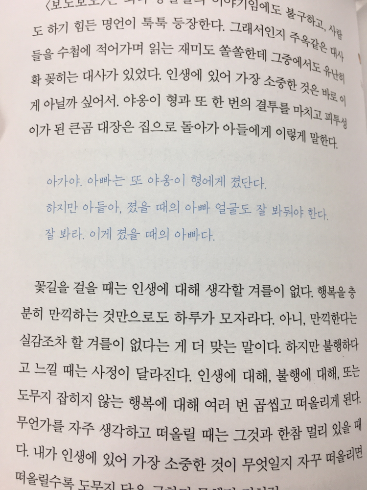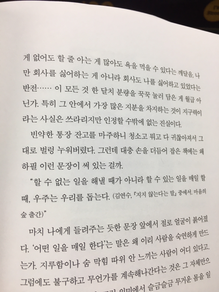 사실 나는 명확히 그런 유형의 사람은 아니다. 평소 크게 심경의 변화가 없는 편이기 때문이다. 그럼에도 역시나 내가 이 책을 보고 크게 빠져들었을 것이라고 예상하였던 사람들은 모두가 정확히 내 예상과 같이 이 책에 큰 감동을 받고 있었다. 저자분이 바랬던 것도 이처럼 상처를 잘받고 업다운이 심하거나 등등... 의 사람들이 힐링받는 책이었을 것이고 정확히 성공한 것이 아닐까 싶다. 물론 그 힐링은 책속에 있을 뿐 실제 삶은 이 책과 상관없이 지구의 표면에서 따로 움직이지만 말이다.