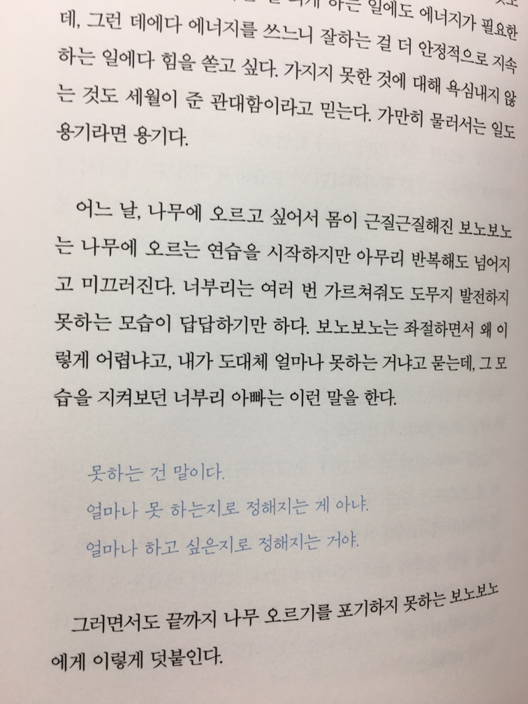 적당히 잘 들어와 녹아들어 있는 삽화는 이 책을 읽는데 있어서 큰 도움을 주는데 그것과 더불어 간혹 등장하는 보노보노 만화 속의 명대사들은 많은 이들에게 공감을 이끌어내기에 충분하다.