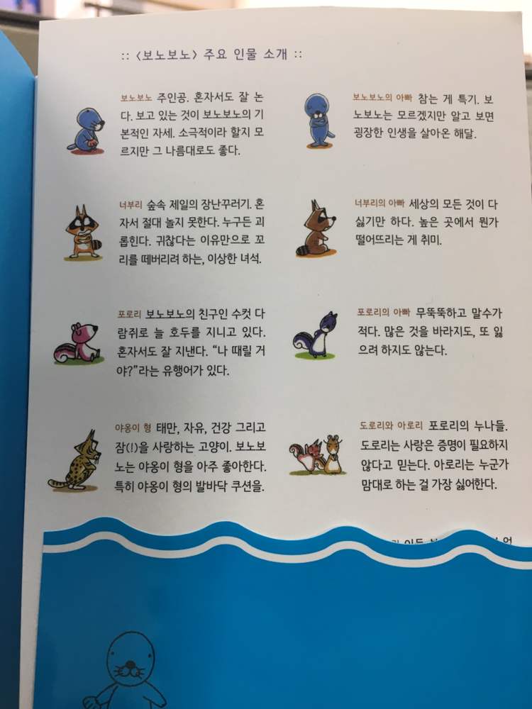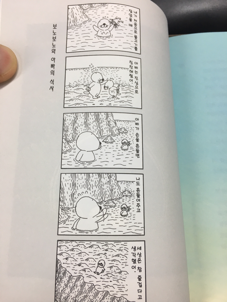 단 한 번이라도 보노보노를 본 적이 있는 사람이라면 알겠지만 보노보노는 느리고 착하며 마음씨가 곱다. 포로리는 좀 촐싹대고 호기심이 많다. 그리고 너부리는 현실을 알고 주로 냉정한 말을 잘 하며 폭력적이기도 하다. 사실 이 세가지 유형의 캐릭터가 실존에서 존재한다면 이처럼 팍팍한 세상을 살기 무척 어려울 것이다. 그리고 저자는 그 만화속에 있는 캐릭터들을 여러가지자신의 에피소드와 함께 한 화면에 입히면서 동질화를 하였다. 그런 사실적인 경험과 만화속의 경험과 공감을 이끌어 내기에 충분해 보인다.