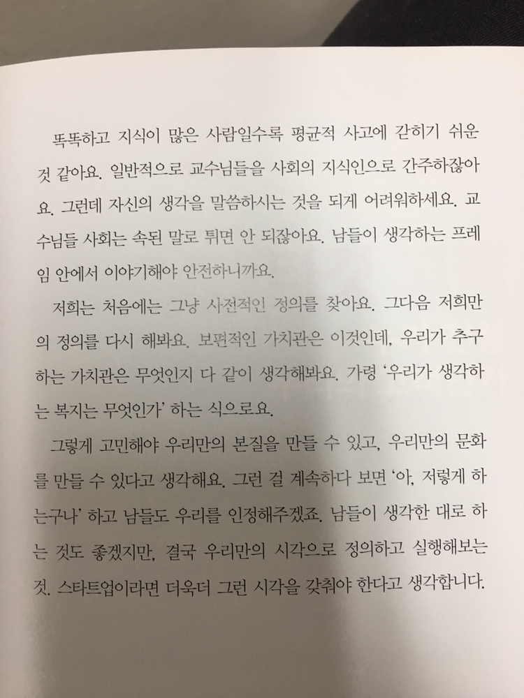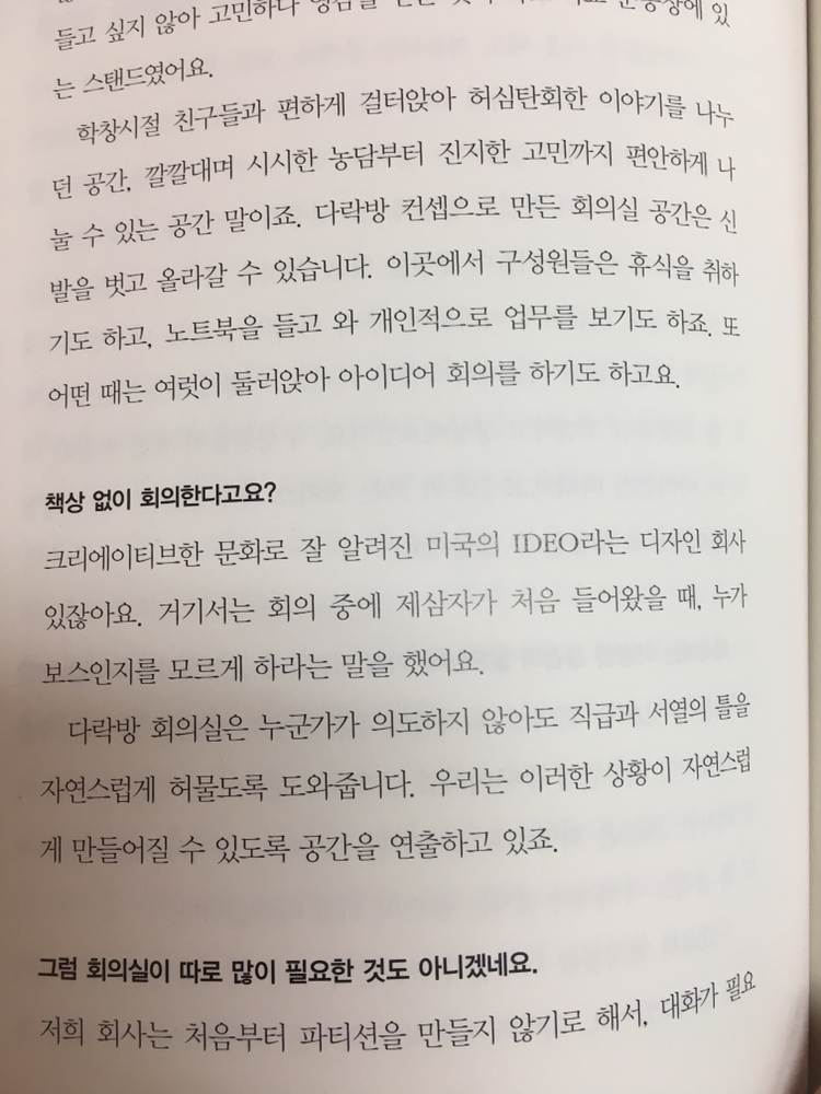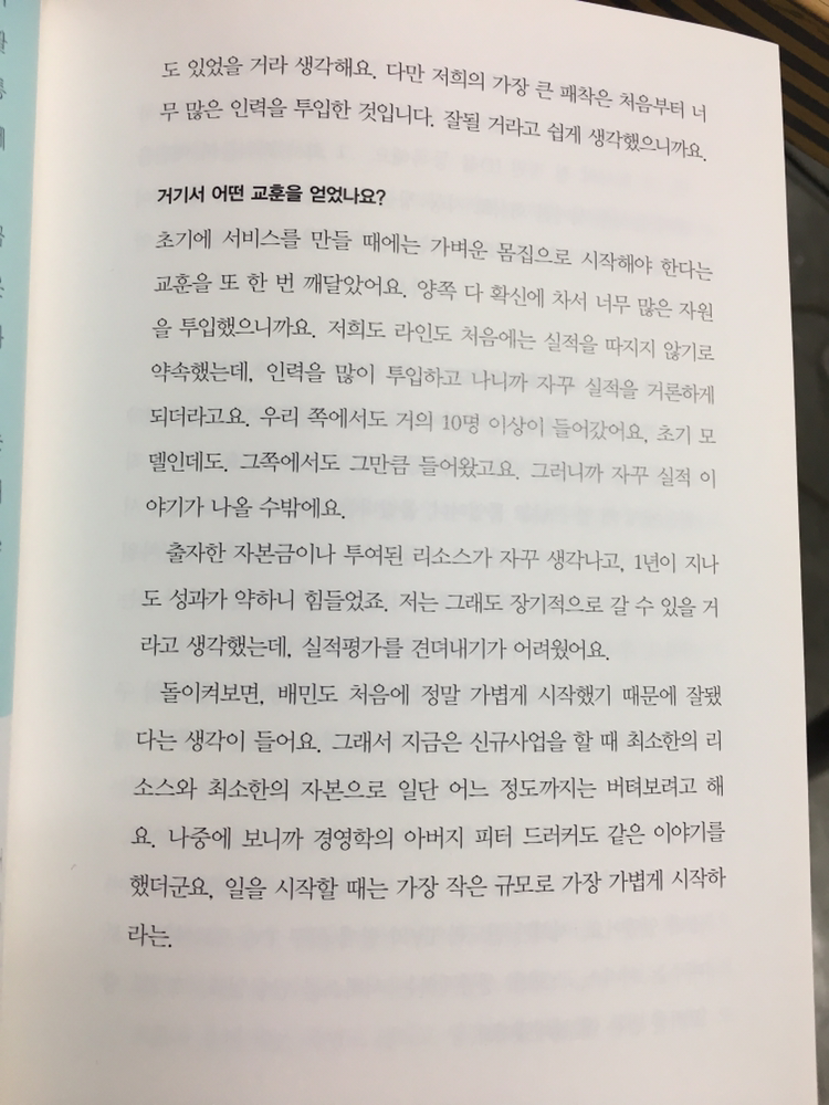 내가 그런 책을 좋아하지 않는 것은 그 성공이 대단하지 않아서가 절대아니다. 그 성공은 감히 내가 평가할 수 없는 수준의 슈퍼 울트라 메가톤급의 특별함이 있지만 책의 재미는 성공의 특별함만으로 충족되지 않기 때문이다. 그런 면에서 배민다움은 성공을 나열하지도 그리고 특별함을 강조하지도 않으면서 기업이 무언가를 이루고 다져나가는 법에 대한 이야기를 전해주고 있다. 또한 그 순서도 나름의 인터뷰를 통한 이야기의 전개순이고 이 책이 정리되는 과정 상에 아마도 도출되었을듯한 이야기 꾸러미들의 소재의 유사성에 기인하는 것이지 결코 기업의 성공을 정리하는 개념은 아닌 것이다.