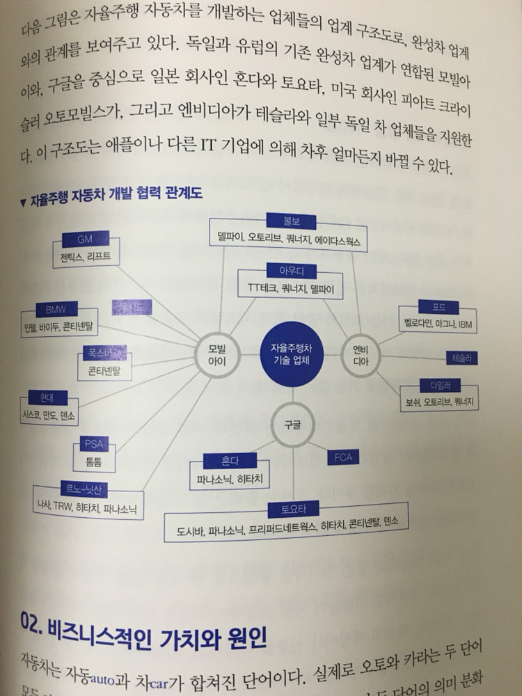 책 안에서는 다양한 그림들이 내용에 대한 이해를 도와주는데 별도의 레퍼런스가 없이 이 책이 만들어지면서 직접 만든 이미지나 정보들도 꽤 많아 보인다. 예를 들어 자율주행에 대한 협력관계의 이미지는 나만하더라도 꽤 많은 관심을 가지고 있는 영역이기는 한데 내가 전혀 모르는 수준의 협력관계까지 기술되어 있어서 놀라기도 하였다.