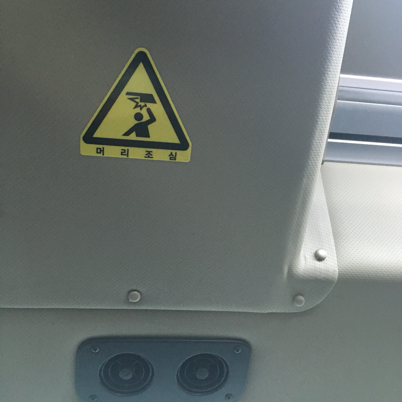 이 스티커의 가장 큰 문제는 머리조심이라는 글씨가 거의 보이지 않는다는 것이다. 흔들리는 버스 안에서 집중력이 흐트러져 있는데 곡면 형태의 천장에 붙어 있는 저 작은 글씨가 보일리가 없다. 저 글씨가 가장 잘 보이는 순간은 이미 머리가 부딪히고 자리에 앉아 천장을 볼때이다.