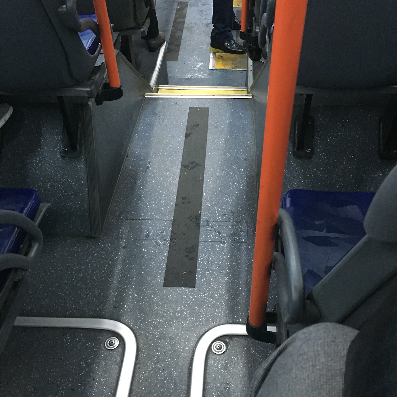 아래 이미지와 같이 버스에는 발 미끄러짐 방지판이 붙어 있다. 특히 오늘과 같이 비가 오는 날이면 이 발미끄러짐 방지판이 더욱 소중해 진다.