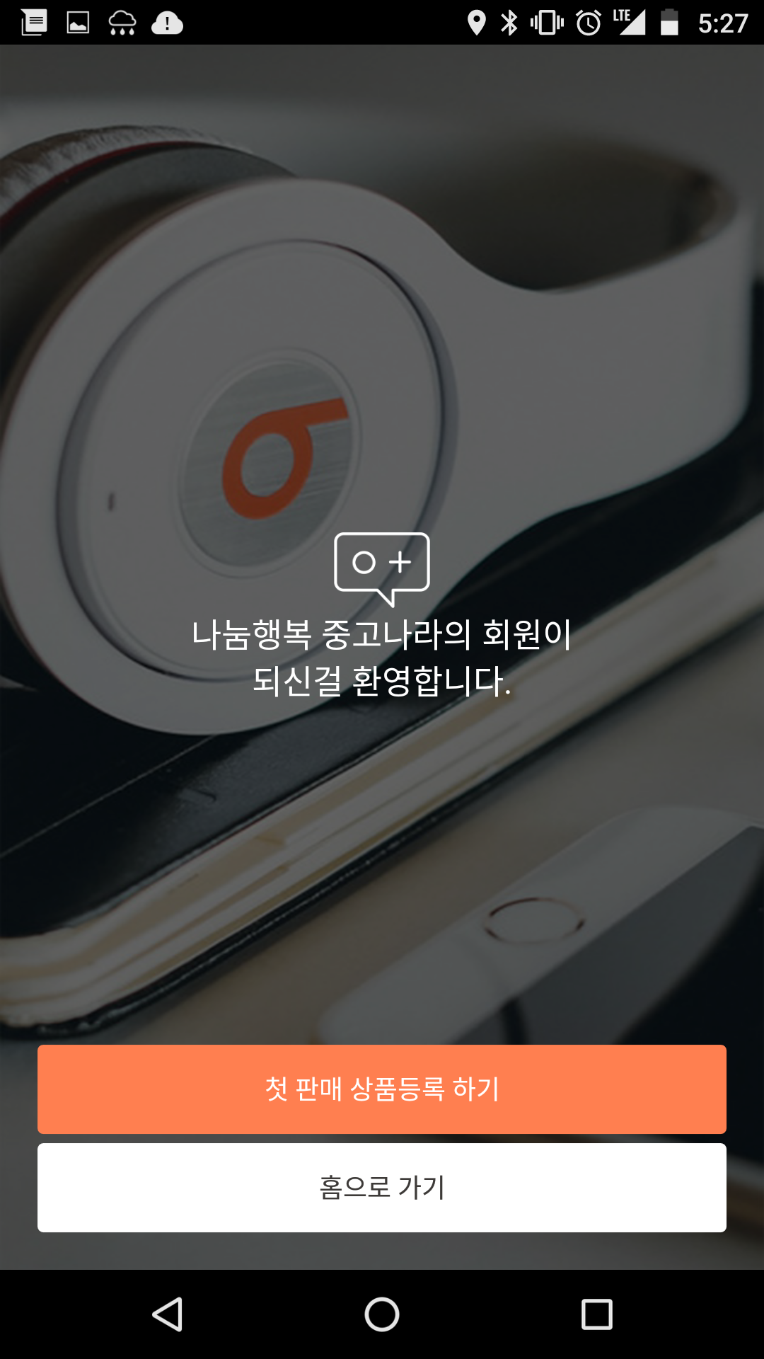 다시 앱으로 돌아와보자. 회원가입을 완료한 화면에는 Beats 헤드폰이 예쁘게 그려져 있고 그 헤드폰에 있는 'B' 이니셜과 같은 색상톤으로 주목도를 높인 '첫 판매상품 등록하기'버튼을 메인버튼으로 만들어 놓았다.