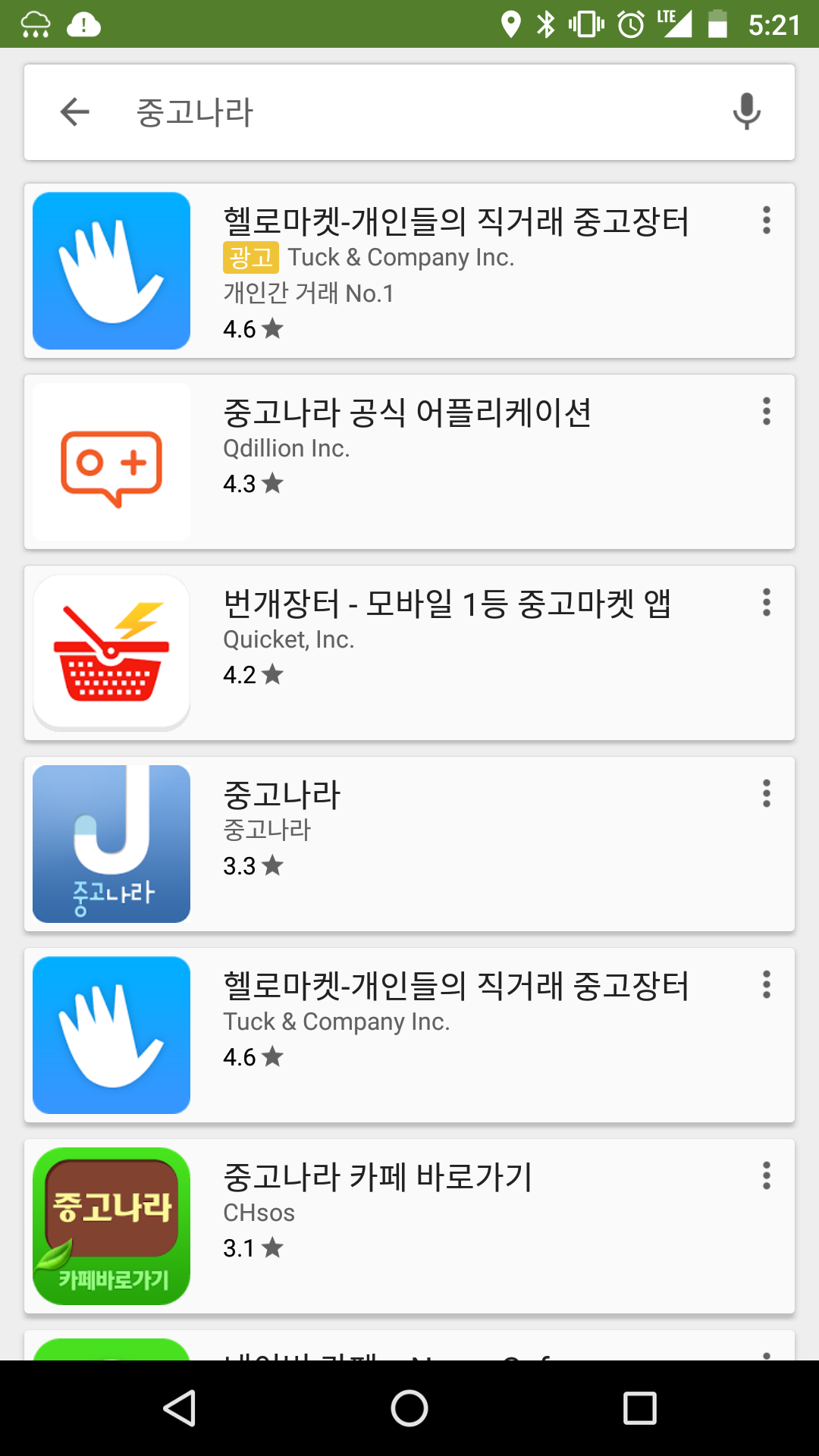 '중고나라'의 검색키워드에 첫번째로 나오는 앱이 '중고나라'앱이 아닌 것이다. 1등은바로 '헬로마켓'이다. 그리고 세번째 앱도 우리가 익히 잘 알고 있는 '번개장터'앱니다.