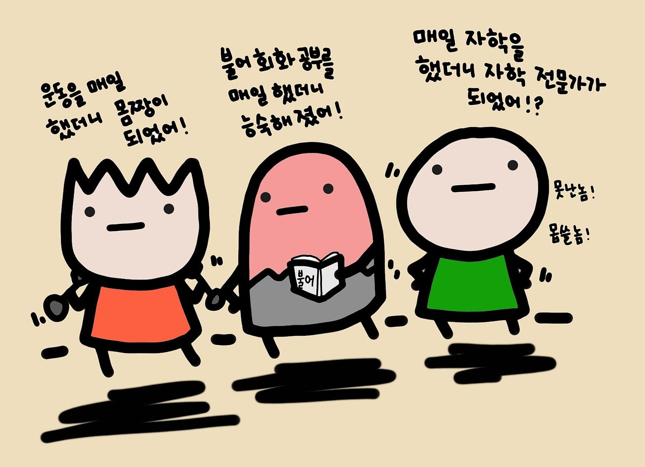 우리는 왜 부정적인 생각에 익숙해진 것일까? 어쩌면 불안감을 기초로 한 우리의 교육 방식의 문제점이 아닌가 생각한다. “잘 될 거야” 우리는 행복해지기 위한 삶보다는 “너 이거 안 하면 망한다” 도태되지 않기 위한, 낙오자가 되는 것을 피하기 위한 삶을 살게 가르친다. 이러한 시선의 차이, 그리고 지속적인 생각의 주입은 전진보다는 후퇴를 피하기 위한 마음가짐, 불안을 탈피하기 위한 생활에 기초를 두게 된 것 같다.