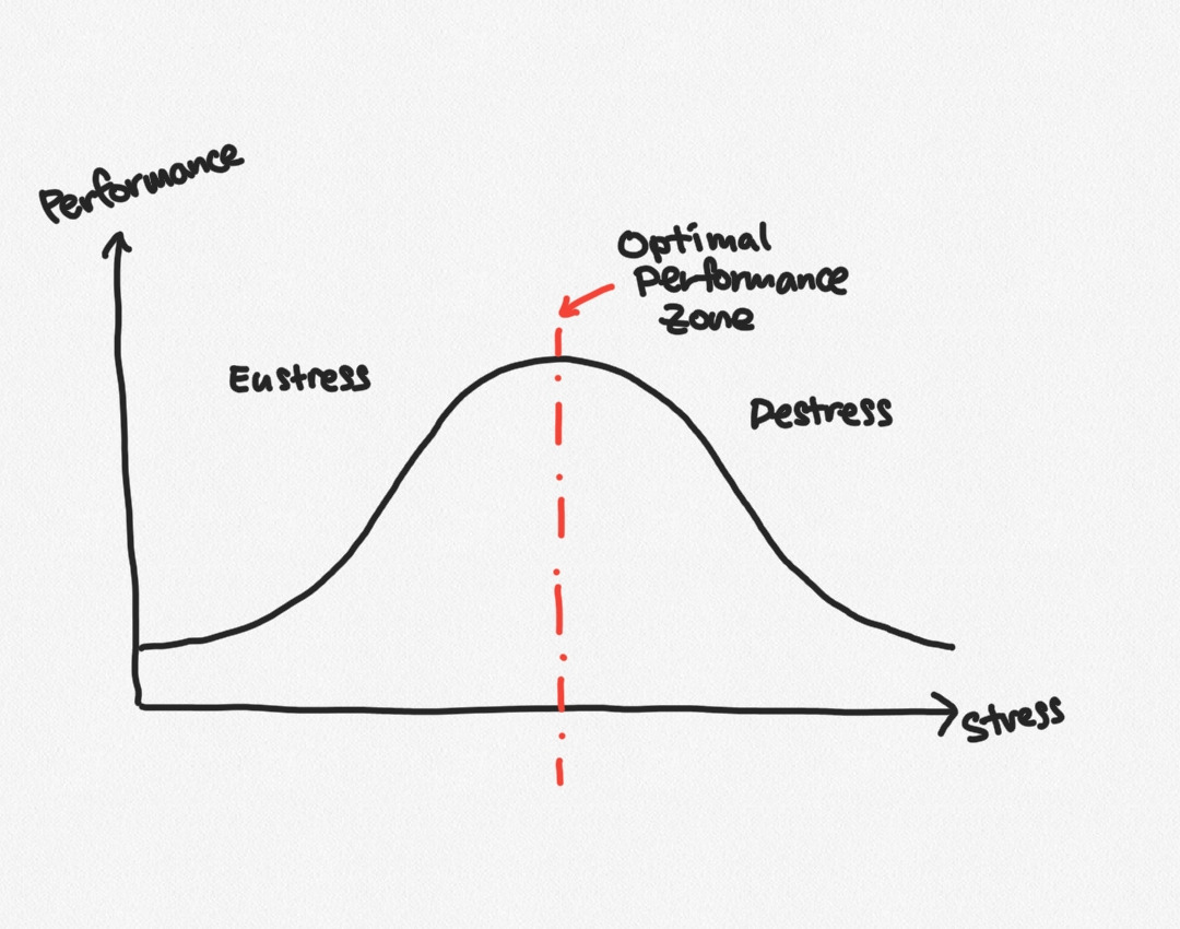 스트레스와 성과 (Performance)의 상관관계. 적당한 스트레스(Eu stress)는 성과를 올려주지만 그 정도가 심해지면 (De stress) 다시 성과가 떨어진다.
