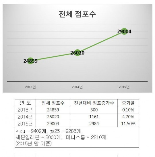 이러한 밝은 전망속에 실제로 한국 편의점 점포수는 증가율 폭이 매년 점증하고 있다. 13, 14년도까지만 해도 한 자리 증가율을 기록하던 것이 15년도를 넘어서면서부터는 두 자리수를 기록한다. 이제는 동네 골목마다 편의점들이 들어서있지만 아직도 매일 10곳의 편의점이 전국 곳곳에서 늘어나고 있다. 이로 인해 이미 과거 한 점포당 배후인구수가 3만여명이던 초창기에 비해 지금은 점포당 배후인구수가 1천여명이하로 감소했다. 일본과 대만 편의점의 배후인구수가 3천여명인걸 감안하면 한국 편의점 시장은 상당히 과포화 된 상태이다. 일반적인 경제상식에 비춰보면 과잉공급 된 시장은 수요와 공급간의 균형점을 찾아가기 위해 공급이 자연스럽게 줄어야 정상이다. 이러한 과잉공급으로 각 편의점들은 매출을 더욱더 나눠갖게 된다. 결국 매출을 결정하는 '객단가x객수'에서 객수가 더욱더 줄어 편의점 폐점수도 급증할 우려가 있다.