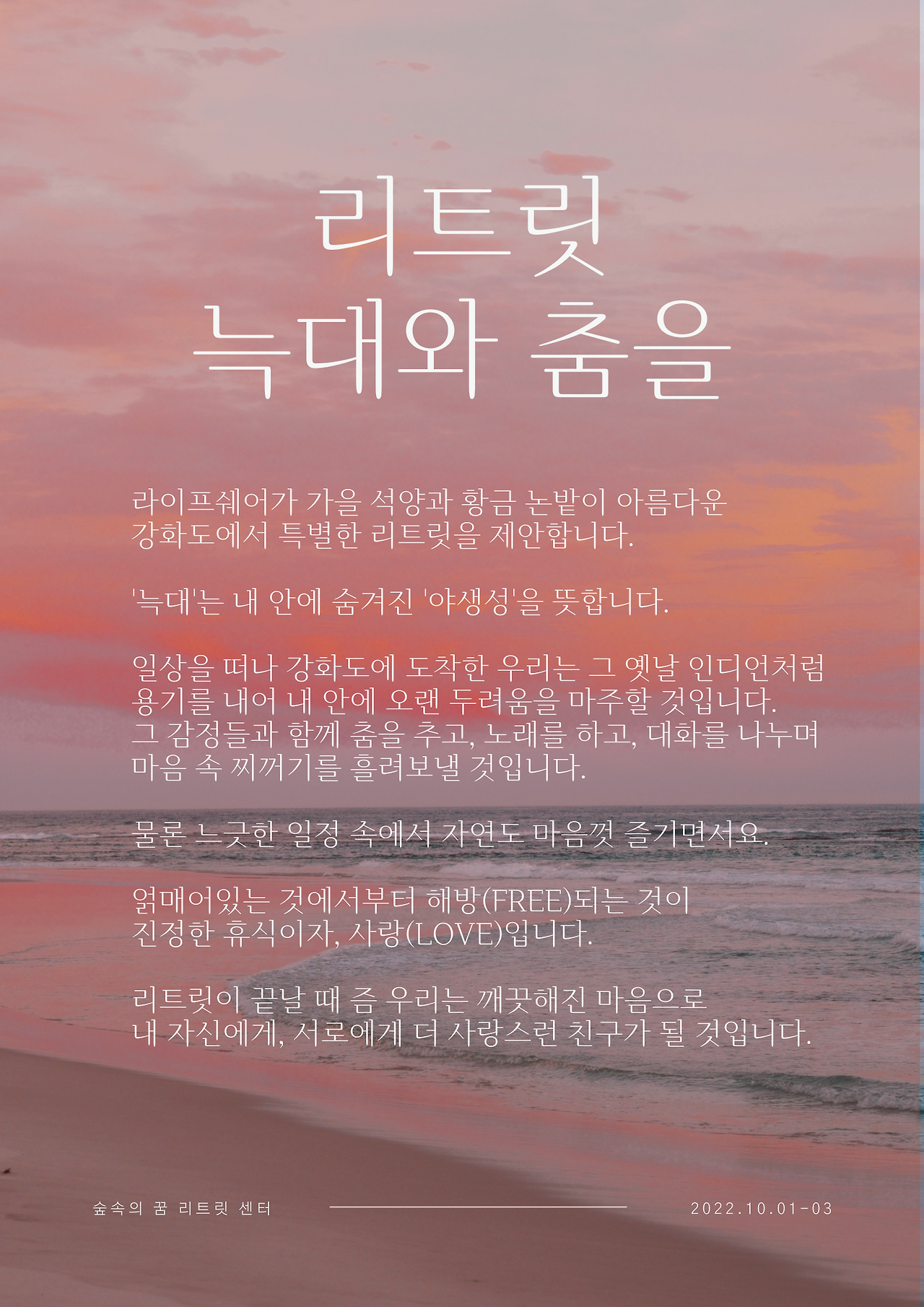 1. 시간 : 2022년 10월 1일(토) ~ 10월 3일(월)_1박 2일 또는 2박 3일 선택하여 참여가능합니다