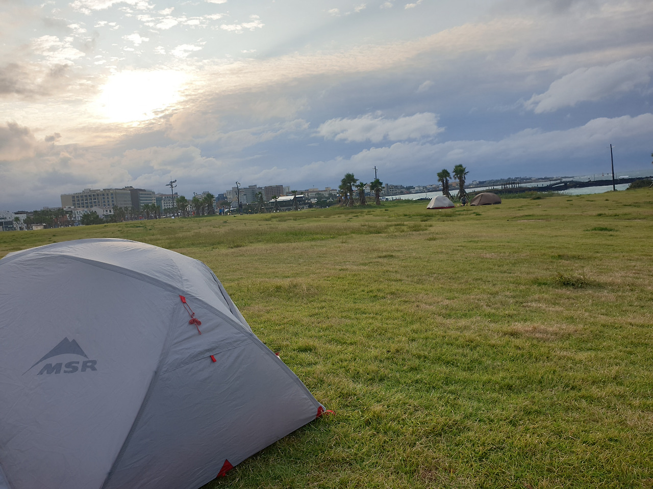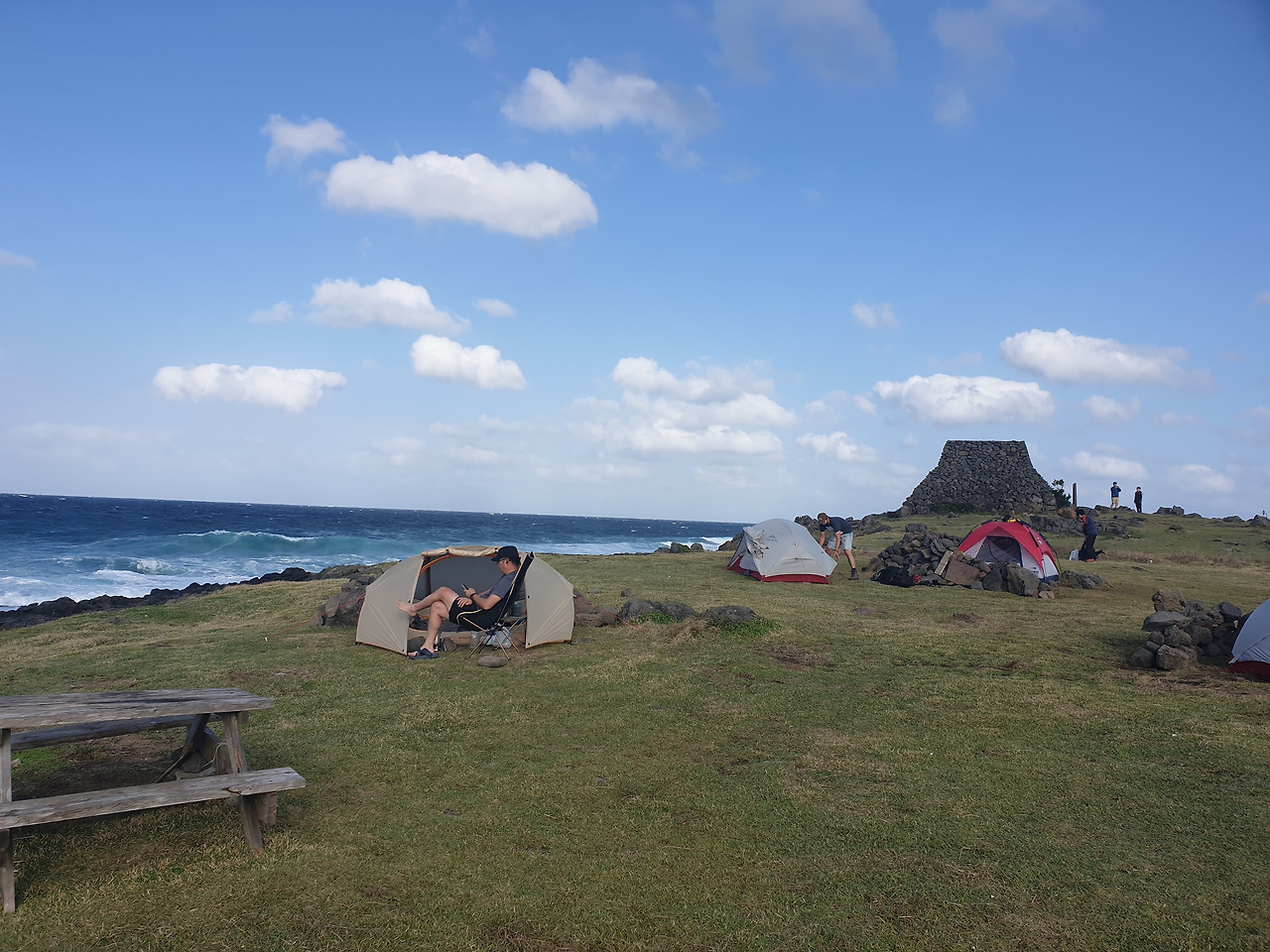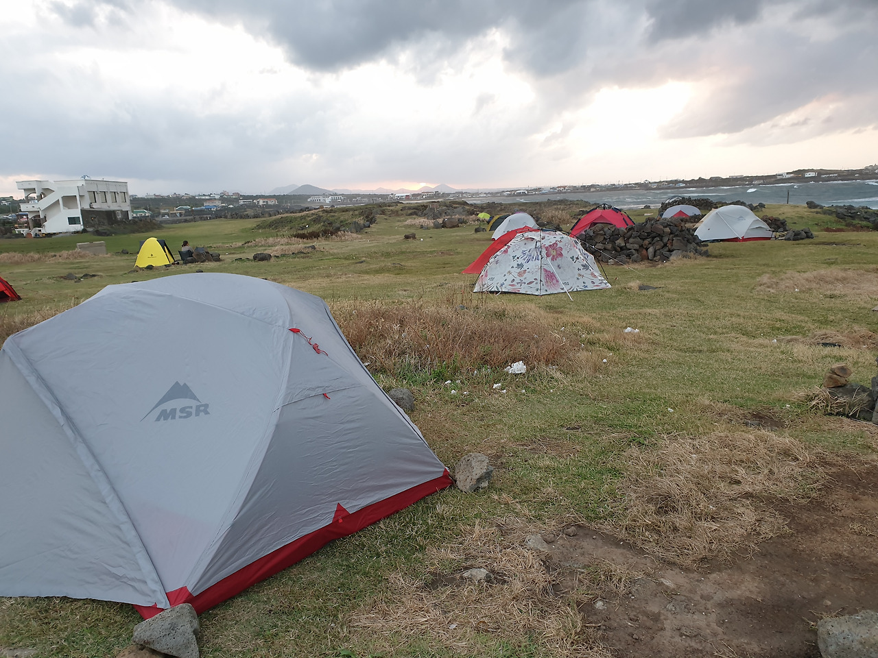 제주공항에서 성산항으로 버스를타고, 우도행 배를 탔다. 20분거리 우도에 도착해서 마을버스를 타고 비양도 입구들어와서 저렇게 자리를 정했다. 여기서 잠깐! 캠핑 시, 자리 선정에 대한 팁!