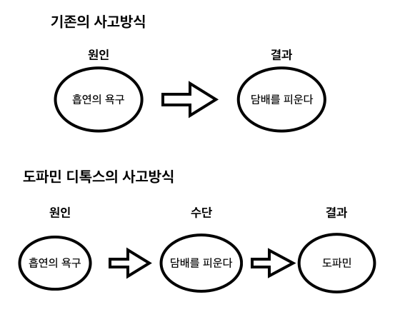 다시 담배 얘기로 돌아가 보자. 흡연의 본질은 사실 담배를 피우는 행위가 아닌 니코틴이 주는 도파민에 있다. 우리는 보통 흡연이라는 행동을 흡연의 욕구로 인한 결과로 생각하지만 사실 결과는 도파민의 분비이며 흡연은 이를 위한 수단이다.