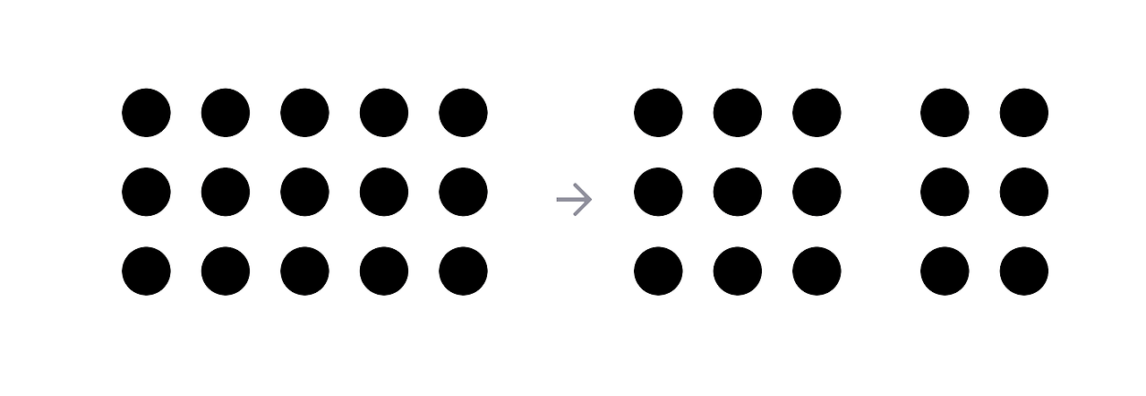 위 이미지를 보면 왼쪽에는 동일한 점들이 일정한 간격으로 배열되어 있다. 이 상태에서는 개별 점보다는 전체가 하나의 덩어리처럼 보인다. 하지만 오른쪽으로 갈수록 점들 사이의 간격이 달라지고, 일정한 거리의 공백이 생기자 인식이 달라진다. 색도 같고, 크기도 같고, 형태도 같은 점들이지만, 우리는 더 이상 하나의 집합으로 보지 않는다. 자연스럽게 두 개의 그룹으로 나누어 인식하게 된다.