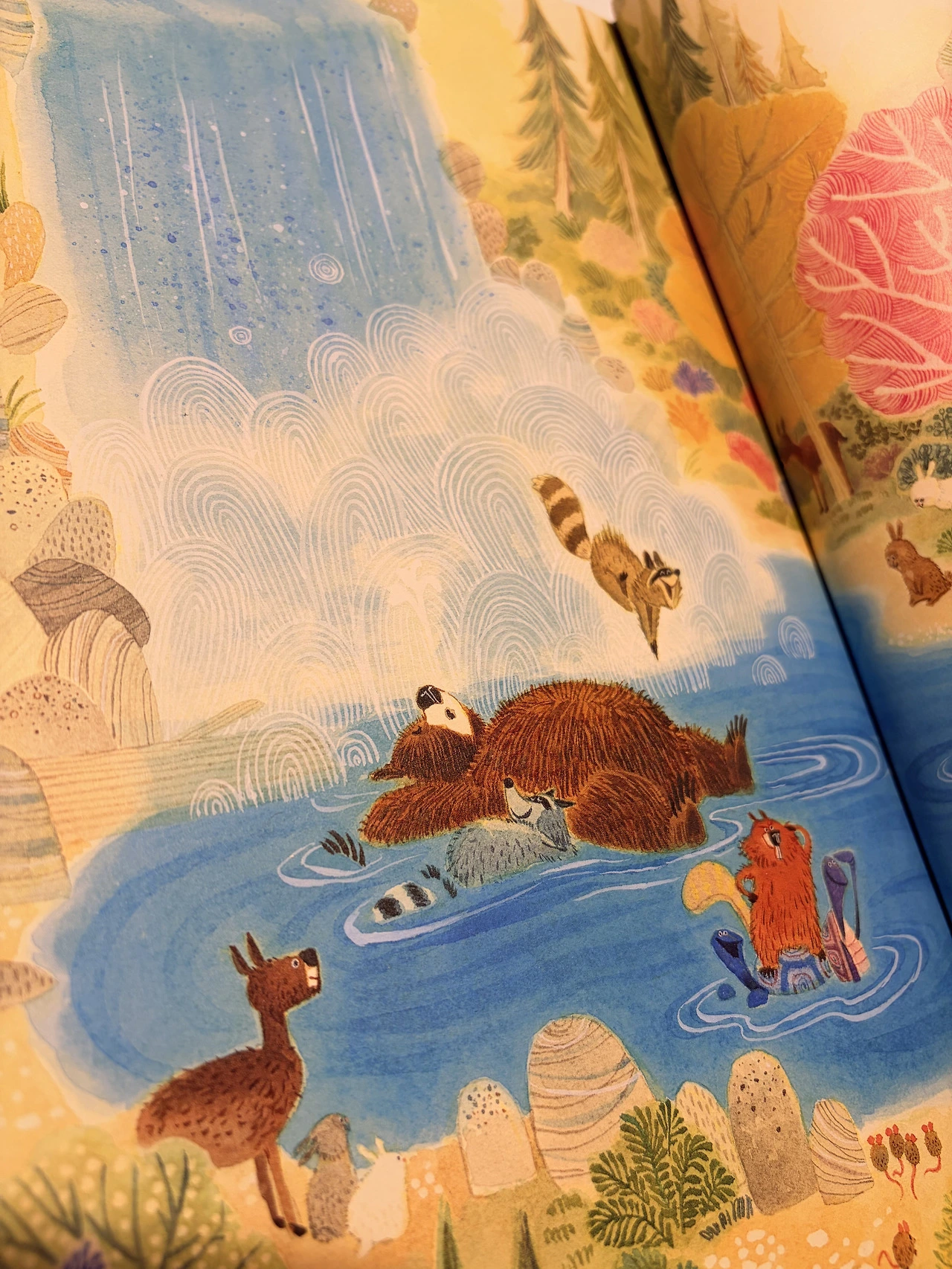 그림책 『곰이 강을 따라갔을 때』는 곰이 여러 친구들과 손을 맞잡고 강을 따라 모험을 완수하는 이야기를 담고 있다. 곰과 친구들은 모험을 끝낸 후 강의 하구에서 평화로운 시간을 보낸다.
