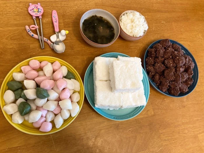 떡은 주문할 때 많이 만들곤 하는데, 아침 생일 축하가 끝나고 나면 재빨리 떡을 작은 접시에 나누어 담는다. 출근해야 하는 남편에겐 회사 동료들과 나눠 먹을 백설기를 쇼핑백에 담아주고, 아이들은 아랫집, 옆집, 아파트 주민들을 위해 수고하시는 경비 아저씨 등께 3종 떡 세트를 담은 접시를 들고 배달 갈 준비를 한다.