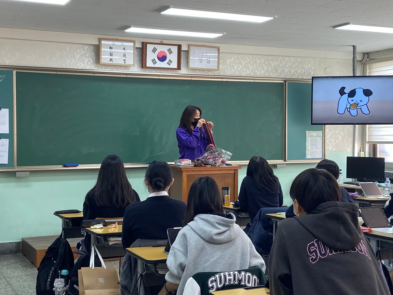 그렇게 마음씨 고운 친구들을 ‘유기견 목도리 만들기’ 봉사활동을 하며 다시 만났다. 여러 학교에 다니며 많은 학생을 만나다 보니, 교실에 들어가면서도 전에 들어왔던 반인지, 긴가민가한데, 교탁에 서서 내 소개를 하니, 나를 알아보는 학생이 있었다. 그제야 확신이 들고, 학생들 얼굴을 찬찬히 보니 떠오르는 기억들. 나는 아이들에게 그간 잘 지냈는지 반갑게 안부를 묻고, 즐겁게 봉사활동을 시작했다.
