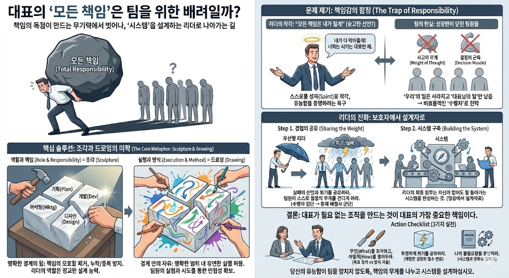 기업의 조직력이 강해지려면 '명확한 책임'과 '유연한 실행'이라는 두 축이 단단해야 합니다. 하지만 모든 책임을 짊어지려는 대표는 본의 아니게 이 두 축을 모두 무너뜨립니다.