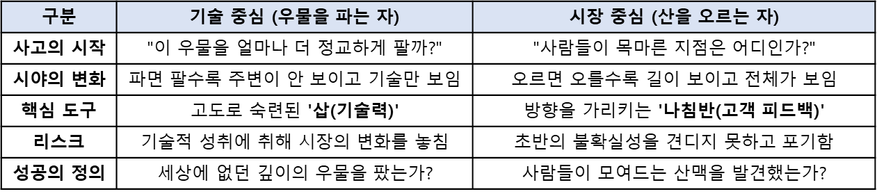 결국, 기술이라는 우물 속에 갇혀 '세상에 없던 정교한 깊이'에 집착할 것인지, 아니면 시장이라는 산을 올라 '사람들이 모여드는 광활한 산맥'을 발견할 것인지의 차이가 사업의 성패를 가릅니다.