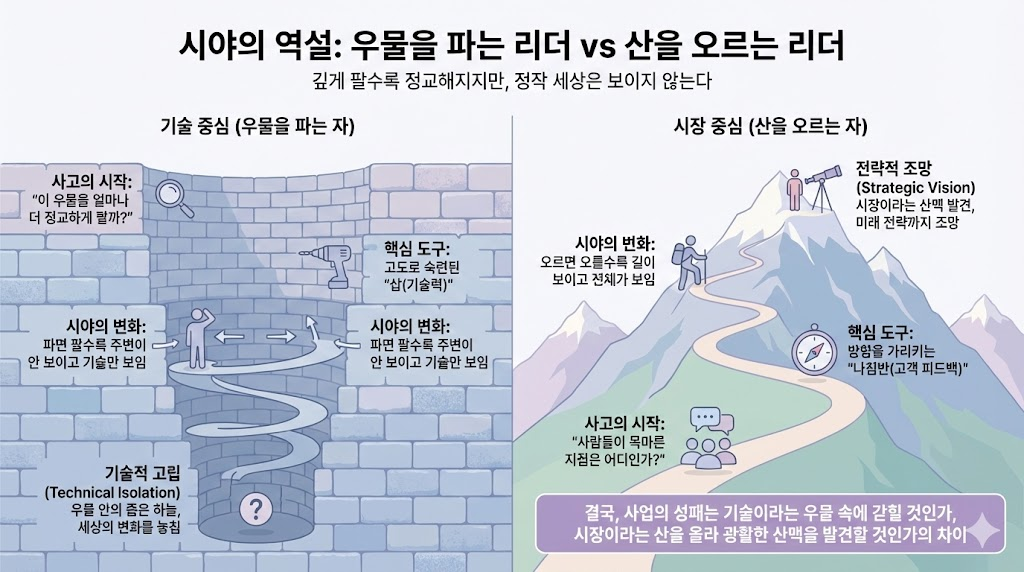 시니어 엔지니어 출신 리더들은 대개 숙련된 '기술'이라는 날카로운 삽을 들고 한 지점을 깊게 파 내려가는 데 탁월한 능력을 발휘합니다. 하지만 여기서 비극적인 '시야의 역설'이 발생합니다. 우물 밖에 있을 때는 주변을 선명하게 보고 우물의 자리를 잘 찾지만, 깊은 곳의 광맥을 찾아내듯 기술적 진보를 이뤄낼수록 리더의 시야는 점점 좁아지기 때문입니다. 우물을 깊게 파면 팔수록 리더는 우물 안의 좁은 하늘만 보게 되며, 정작 우물 밖 세상이 어떻게 변하고 있는지, 사람들이 목이 말라 강으로 떠나고 있지는 않은지 알 길 없는 '기술적 고립'에 빠집니다. 이는 철저히 내부의 유능함을 밖으로 밀어내는 '프로덕트 아웃 (Product-Out)'의 관점에 갇혀, 기술이라는 우상을 숭배하느라 시장이라는 실체를 놓치는 결과를 초래합니다.