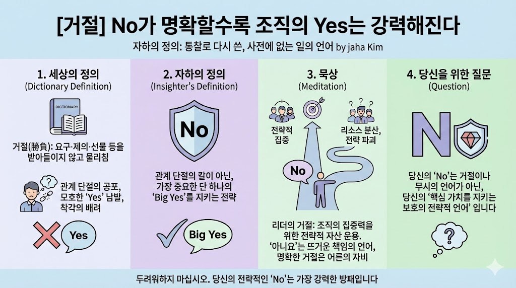 격변기일수록 '아니요'라는 말은 차가운 거부가 아니라, "우리는 이 길을 가기로 했고, 나는 당신과 우리 팀을 위해 이 길을 끝까지 지키겠다"는 가장 뜨거운 책임의 언어가 되어야 합니다. 모호한 승낙으로 희망 고문을 하는 것보다, 명확한 거절로 서로의 시간을 아껴주는 것이 어른의 자비입니다.
