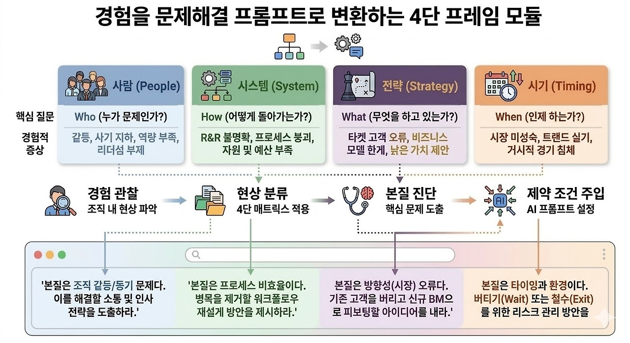 "문제가 복잡하다"라고 말하지 마십시오. 단지 당신이 당신의 경험을 "4가지로 분류하지 않았을" 뿐입니다. 혼란스러운 현상을 [People - System - Strategy - Timing]으로 해체하는 순간, 당신의 비정형 경험은 AI를 가장 날카롭게 지휘하는 완벽한 프롬프트의 뼈대가 됩니다.