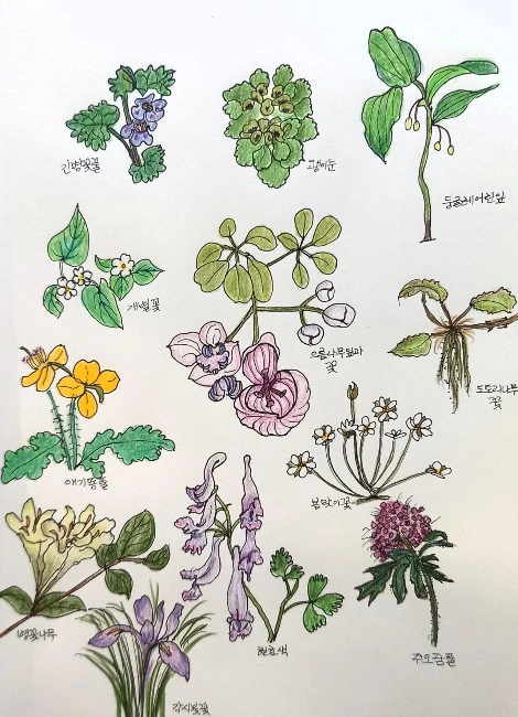 물가 근처의 길섶에는 긴병꽃풀이 청보라의 작은 꽃으로 지나는 사람의 눈을 가득 채운다. 호젓한 양지엔 둥굴레가 옅은 옥색 귀걸이의 꽃을 주렁주렁 매달고 있고 반그늘진 산자락엔 어김없이 연보랏빛 현호색이 낮게 깔려있다. 해가 강한 곳엔 거의 흰색에 가까운 색을 띤다. 머리를 들고 조금 멀리 산등성이를 바라보면 언뜻언뜻 보랏빛이 보인다. 작은 각시붓꽃이 사람들의 손을 탈까 조심스러운 듯 등산로에서 가능한 멀리 떨어져 피어 있다. 집 마당에 피는 붓꽃과 비슷한 모양과 색이지만 꽃의 크기와 줄기의 길이가 절반 정도로 작다. 붓꽃을 발견하는 순간 여기저기 흩어진 채 피어 있는 붓꽃들이 발견된다.