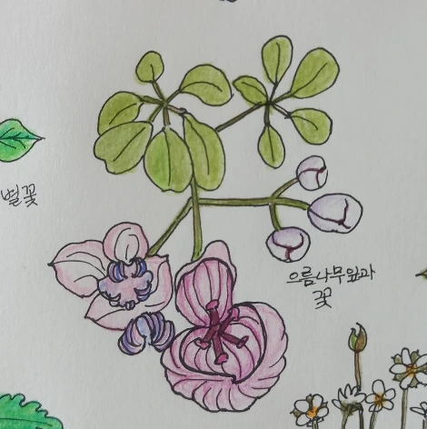 분명 뿌리는 하나로 시작하는 모습인데 엉킨 나무기둥이 두 개로 갈라졌다. 산벚꽃과 으름나무가 서로의 기둥을 두어 번 휘감고 엉켜있다. 각각의 껍질을 보니 확연히 다르다. 벚꽃나무는 껍질에 작은 입술 같은 무늬가 그득하고 으름나무는 맨들 거리는 느낌의 껍질이다. 으름나무의 꽃이 덩굴을 이루며 매달려 있는데 으름꽃은 처음 본다. 오늘의 수확이다. 청개구리 발가락처럼 다섯 개로 벌어진 가지마다 잎이 나 있고 잎의 색은 맑은 연둣빛이다. 꽃은 우아하며 비밀스럽다. 내 손이 이들의 색을 따라가지 못해 서운하다.