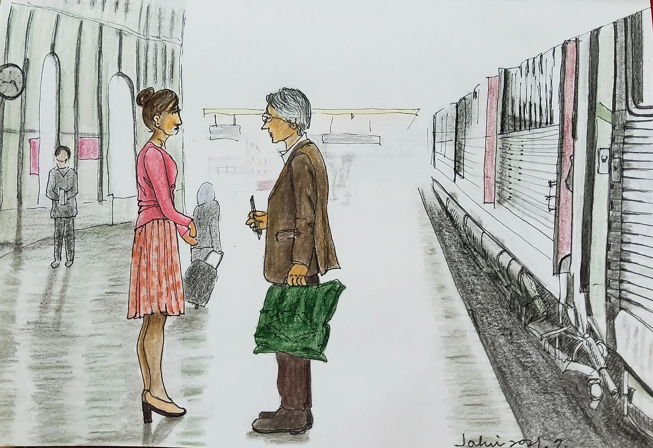 햇살이 환한 기차역. 마지막 장면. (이 둘은 그림보다 훨씬 미남, 미녀다.)