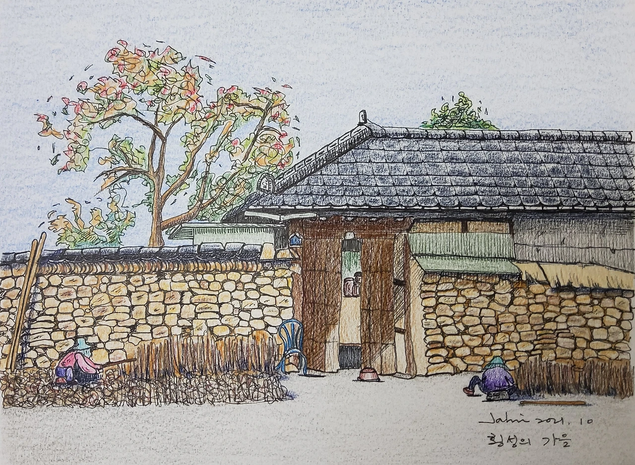시골집 안마당의 커다란 나무는 지붕보다 높게 자랐다. 나무에 고운 단풍이 들고 충분히 시간을 보낸 잎들은 순한 바람에도 후드둑 떨어진다. 많이 비워낸 가지들이 굵직하다. 물드는 잎들은 떨어지기 위해 물든다.